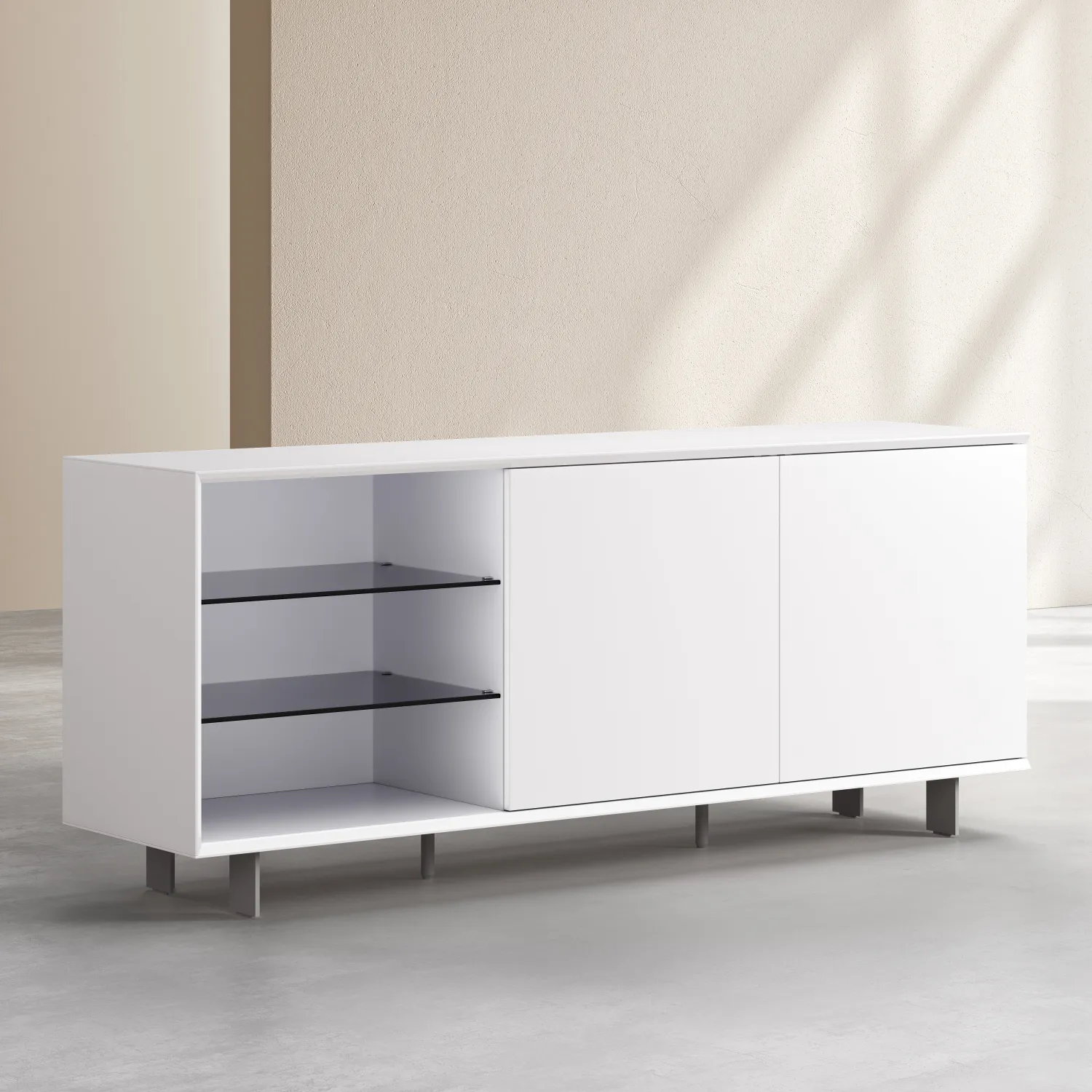 Buffet bas Agnes blanc polaire avec pieds métal : design contemporain, rangements fonctionnels et niches ouvertes pour sublimer salons et salles à manger.