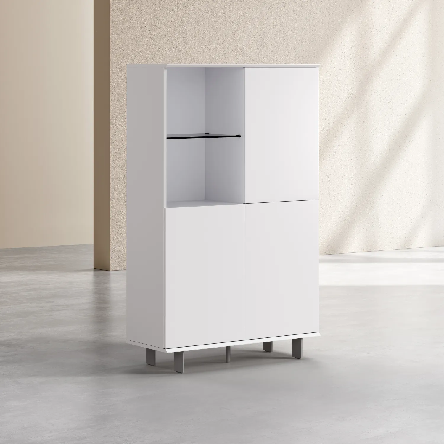 Buffet haut Agnes blanc polaire avec pieds métal : design contemporain, rangement optimal et niche en verre pour sublimer salons et salles à manger.
