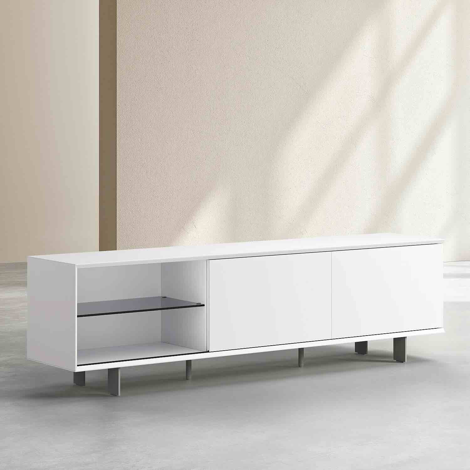 Équipé de deux portes coulissantes et d’une niche ouverte avec tablette en verre trempé, il offre un espace idéal pour organiser vos appareils multimédias et objets décoratifs. Une ouverture discrète à l’arrière permet le passage des câbles pour un rendu toujours soigné.