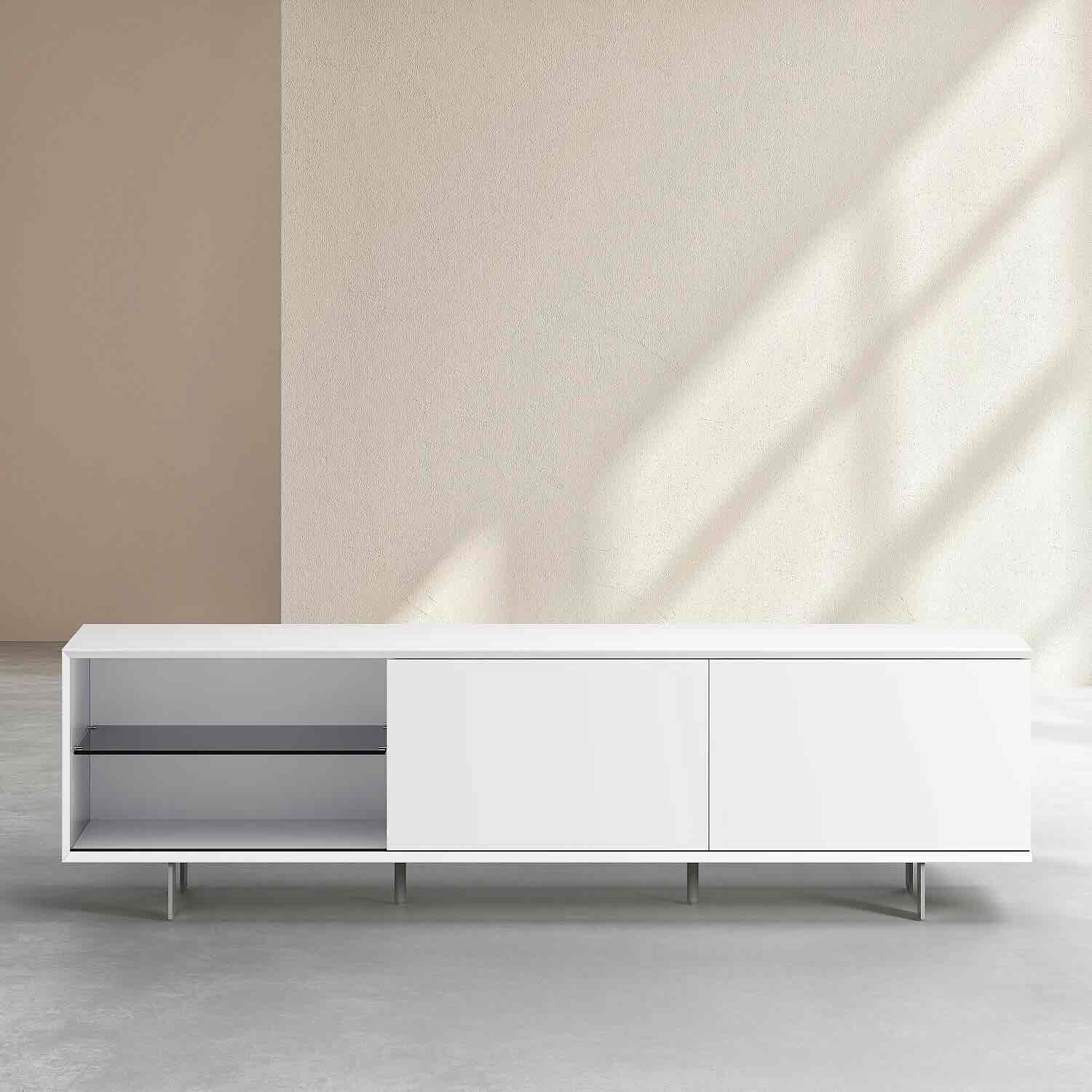 Meuble TV Agnes blanc polaire avec portes coulissantes et pieds métal : design épuré, rangements fonctionnels et élégance contemporaine pour le salon.