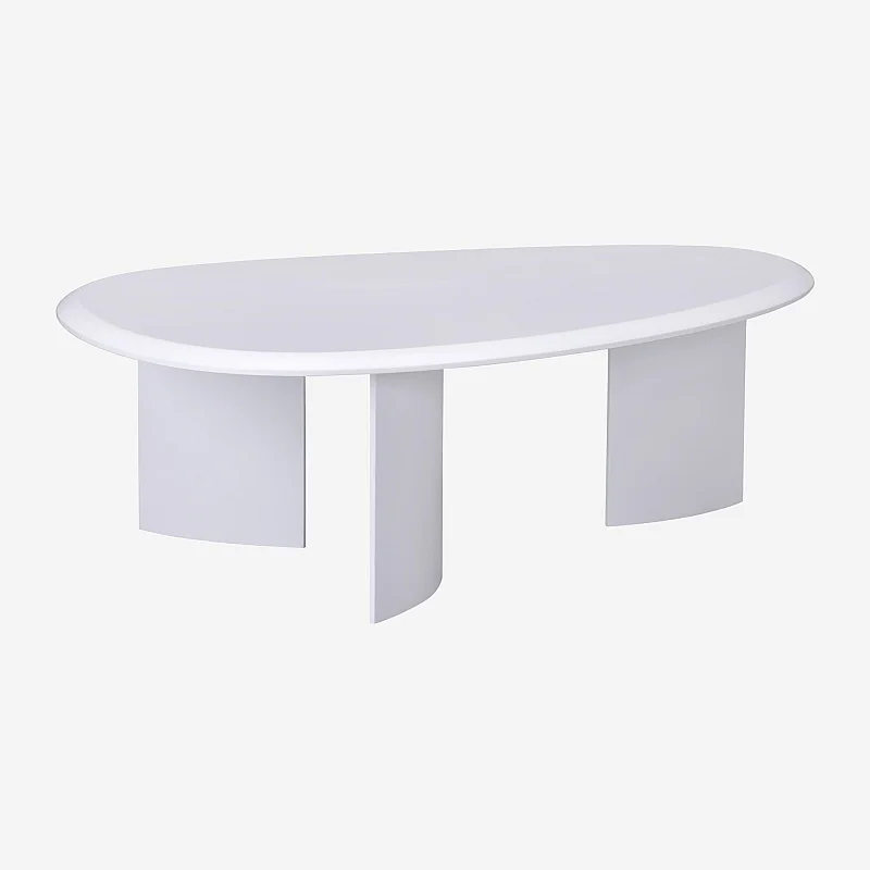 Table basse Amalia au design organique en finition mate blanc polaire. Plateau asymétrique et pieds incurvés pour un intérieur lumineux, équilibré et raffiné.