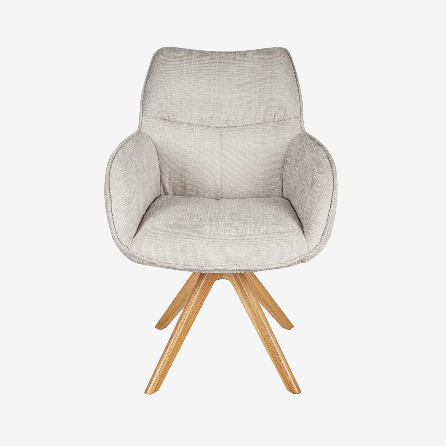 La chaise Arzana allie tissu chenille ivoire, assise à ressorts ensachés et piètement en chêne clair pour un confort enveloppant et un design élégant et intemporel.