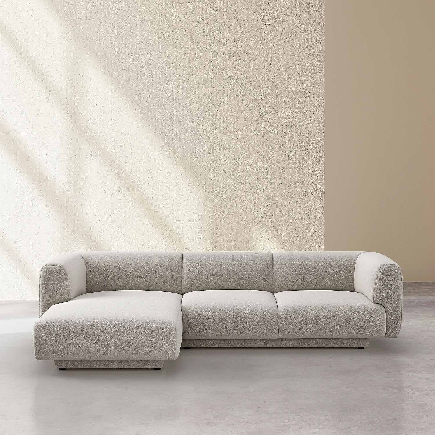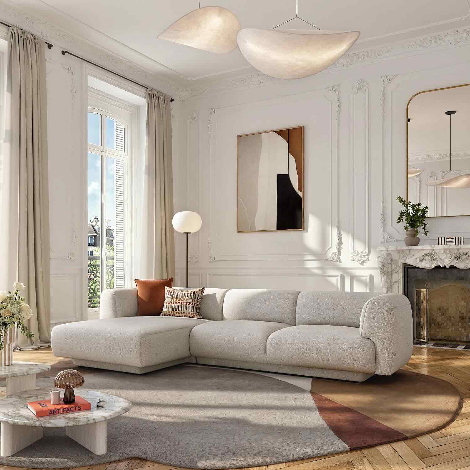 Canapé d’angle droit Austin 4 places en tissu grège : design organique, confort enveloppant et élégance intemporelle signée Federica Francini.