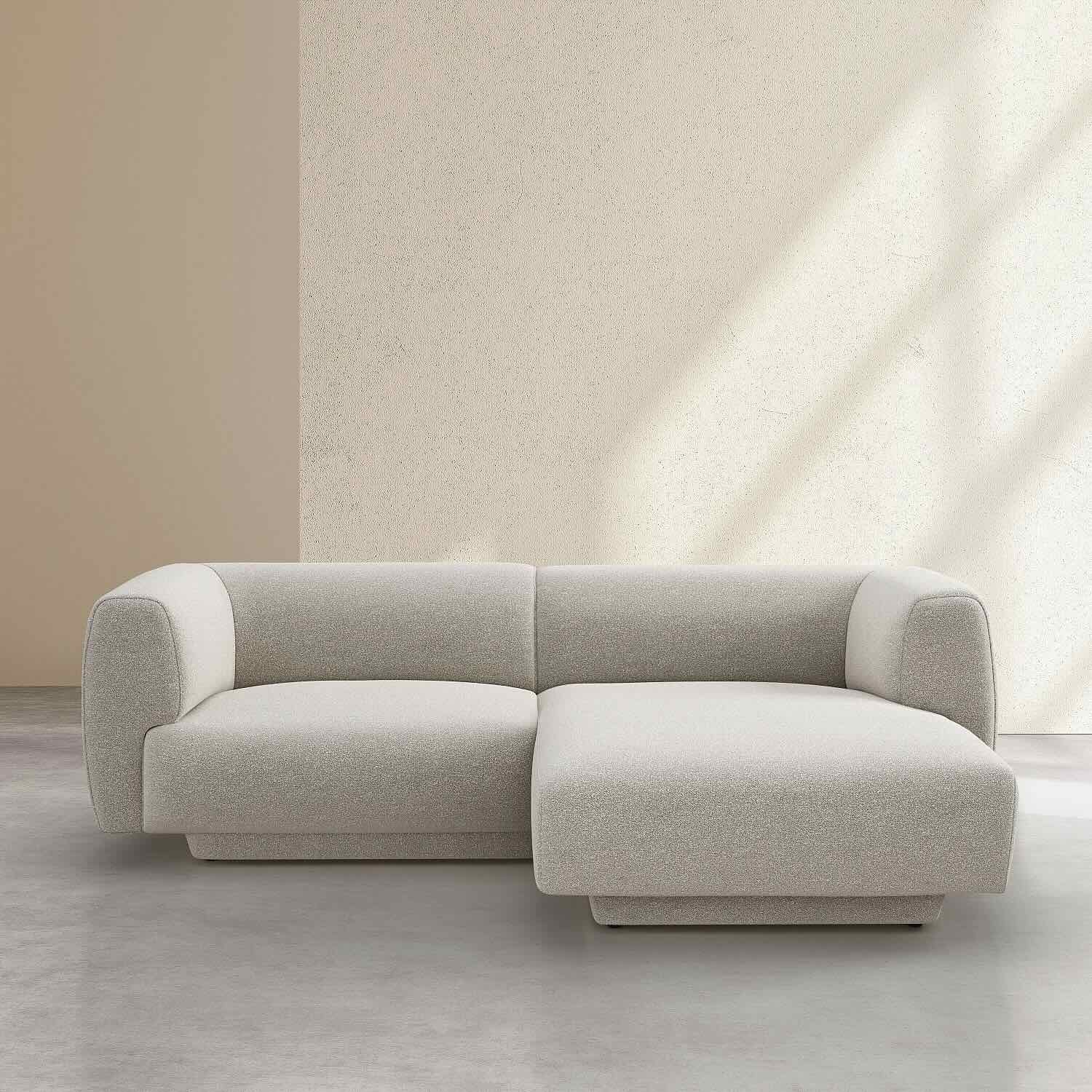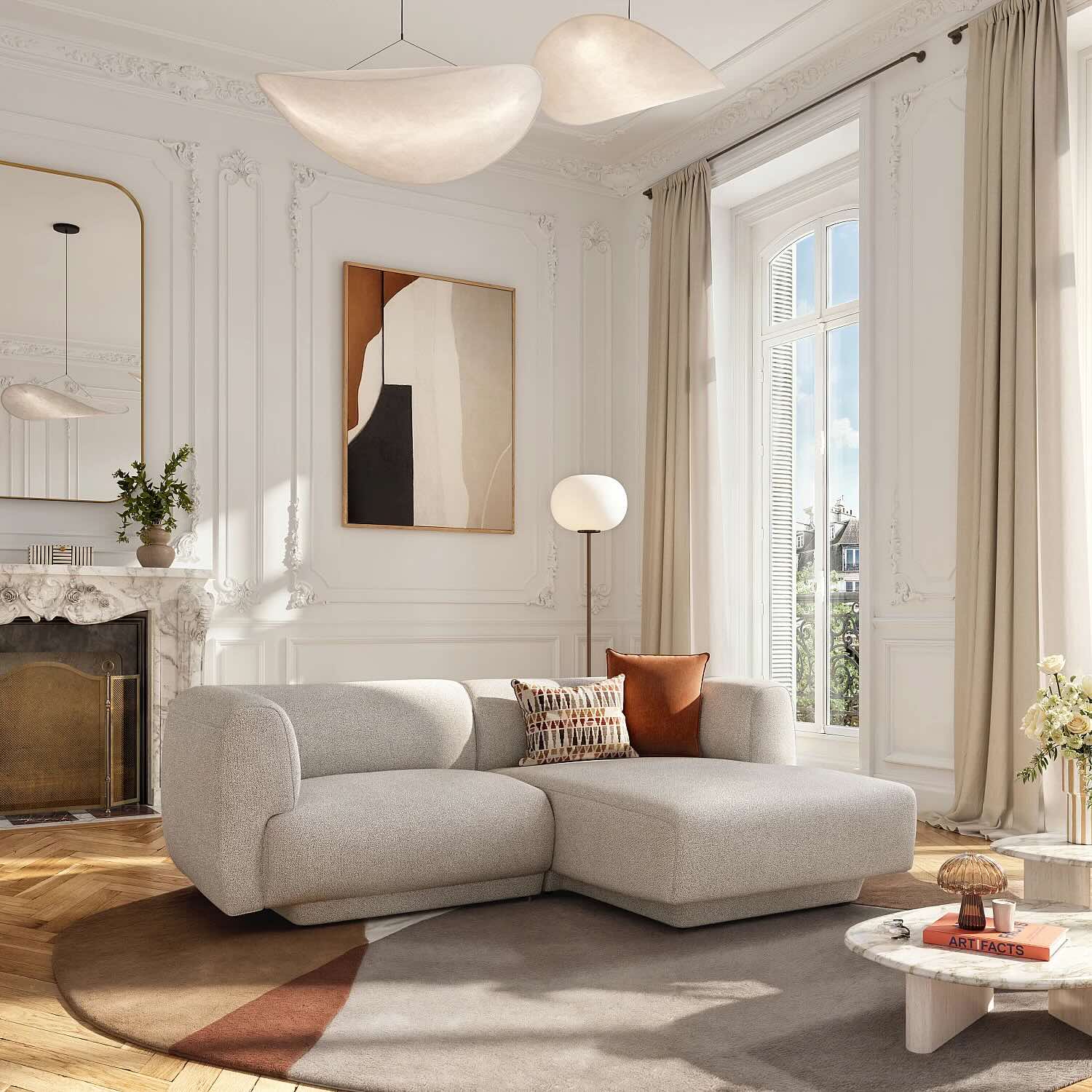 Canapé d’angle droit Austin en tissu texturé grège, design Federica Francini. Formes organiques, confort durable et méridienne spacieuse pour un salon chaleureux et contemporain.
