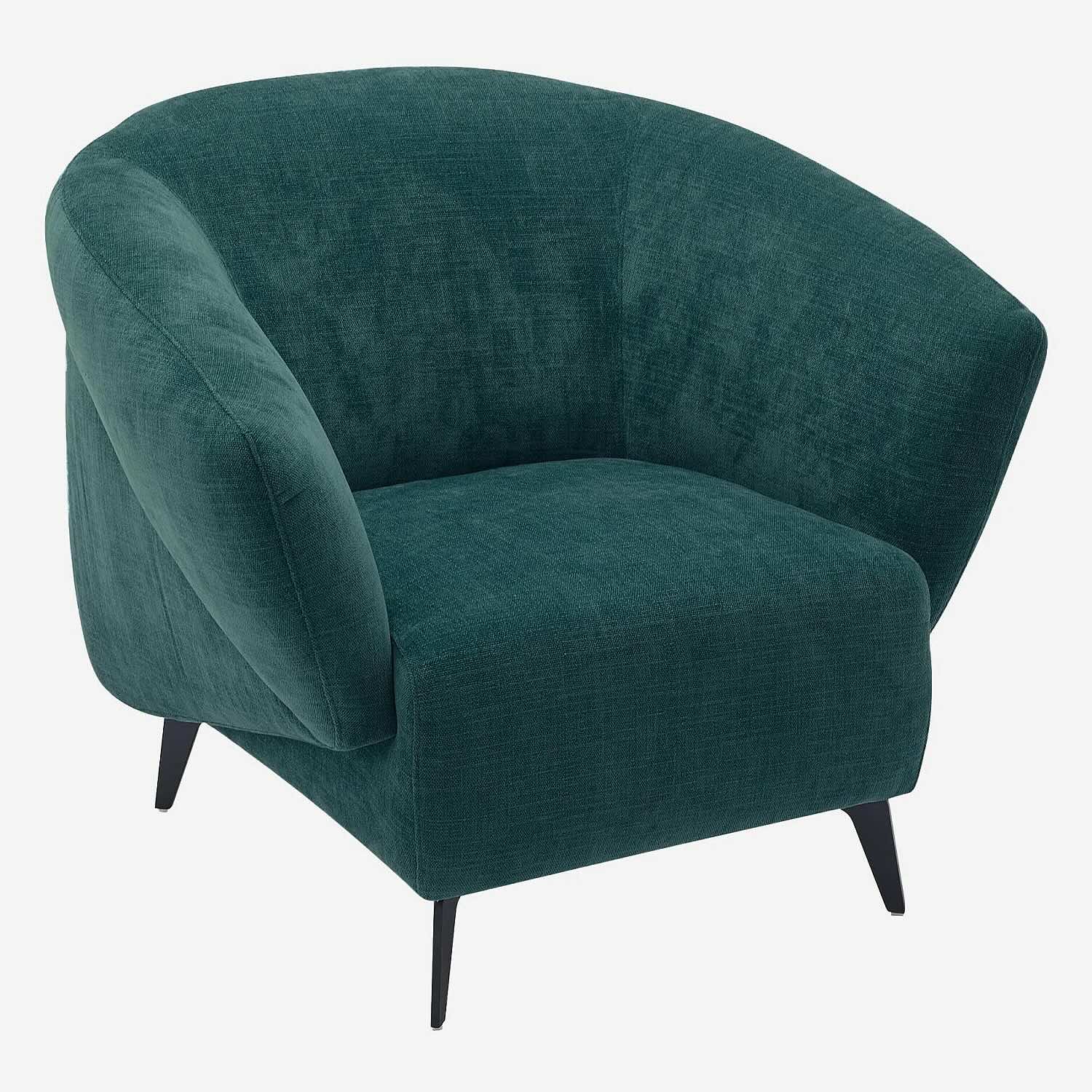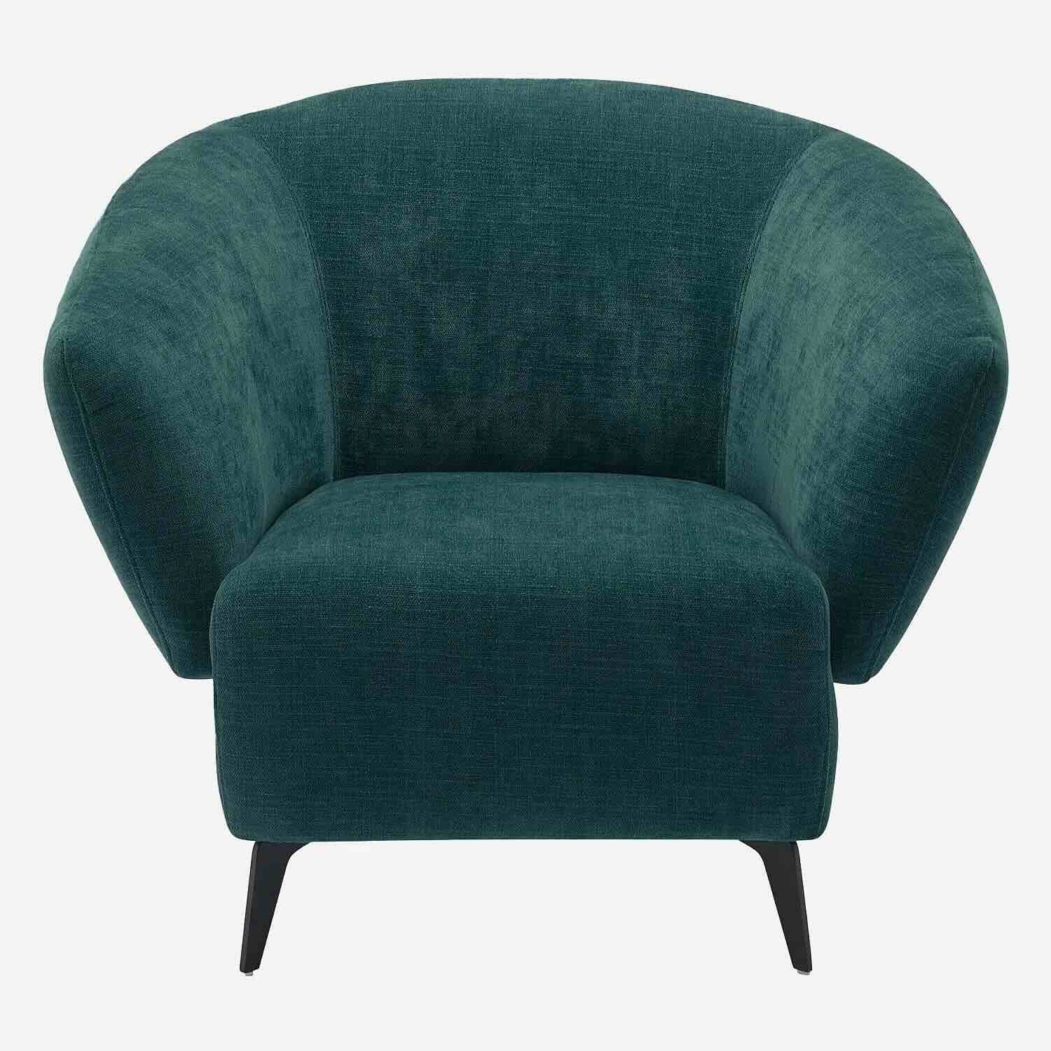 Fauteuil Brecio en tissu bleu canard signé Nicole Aptel. Confort haute résilience, larges accoudoirs et piètement en métal noir pour un intérieur raffiné.