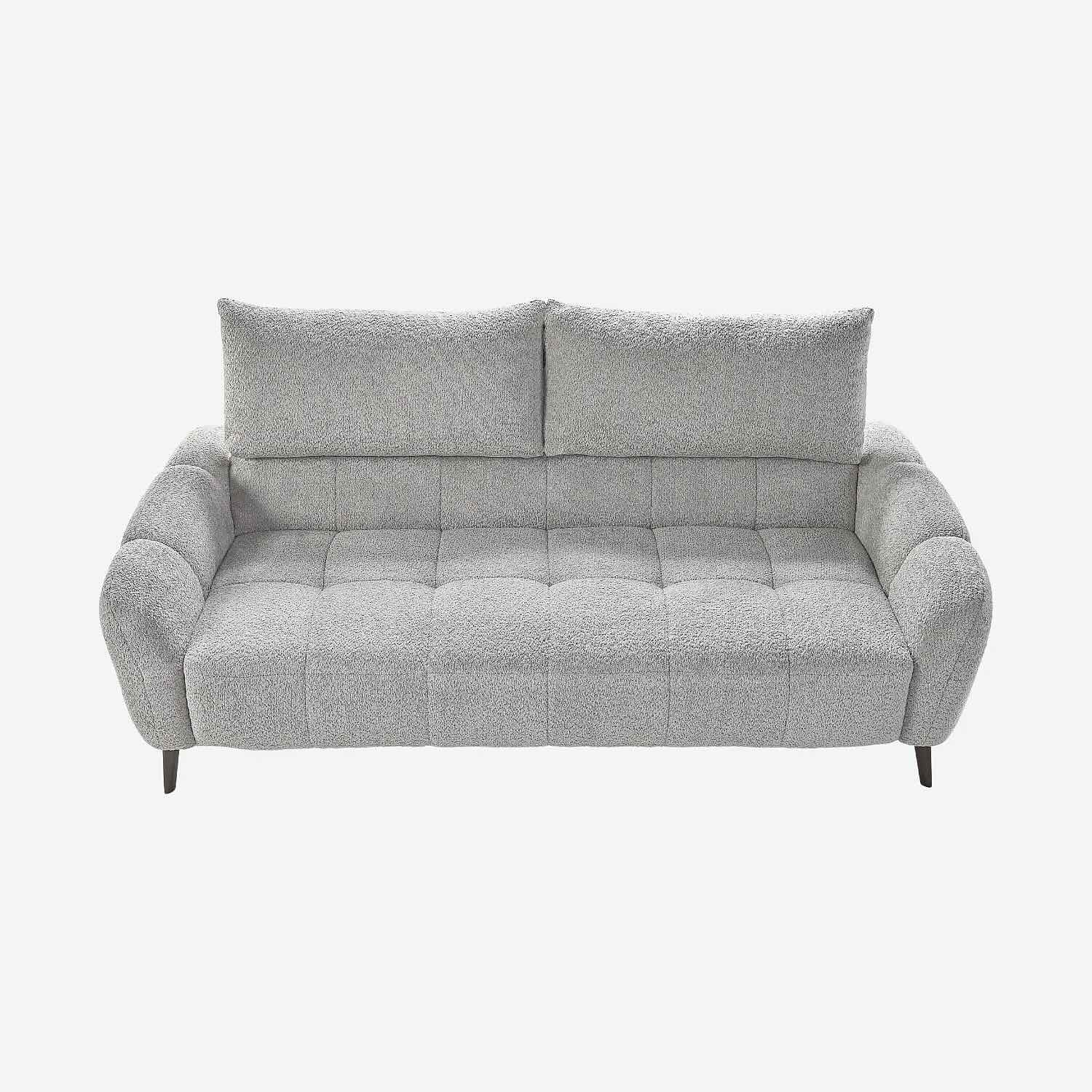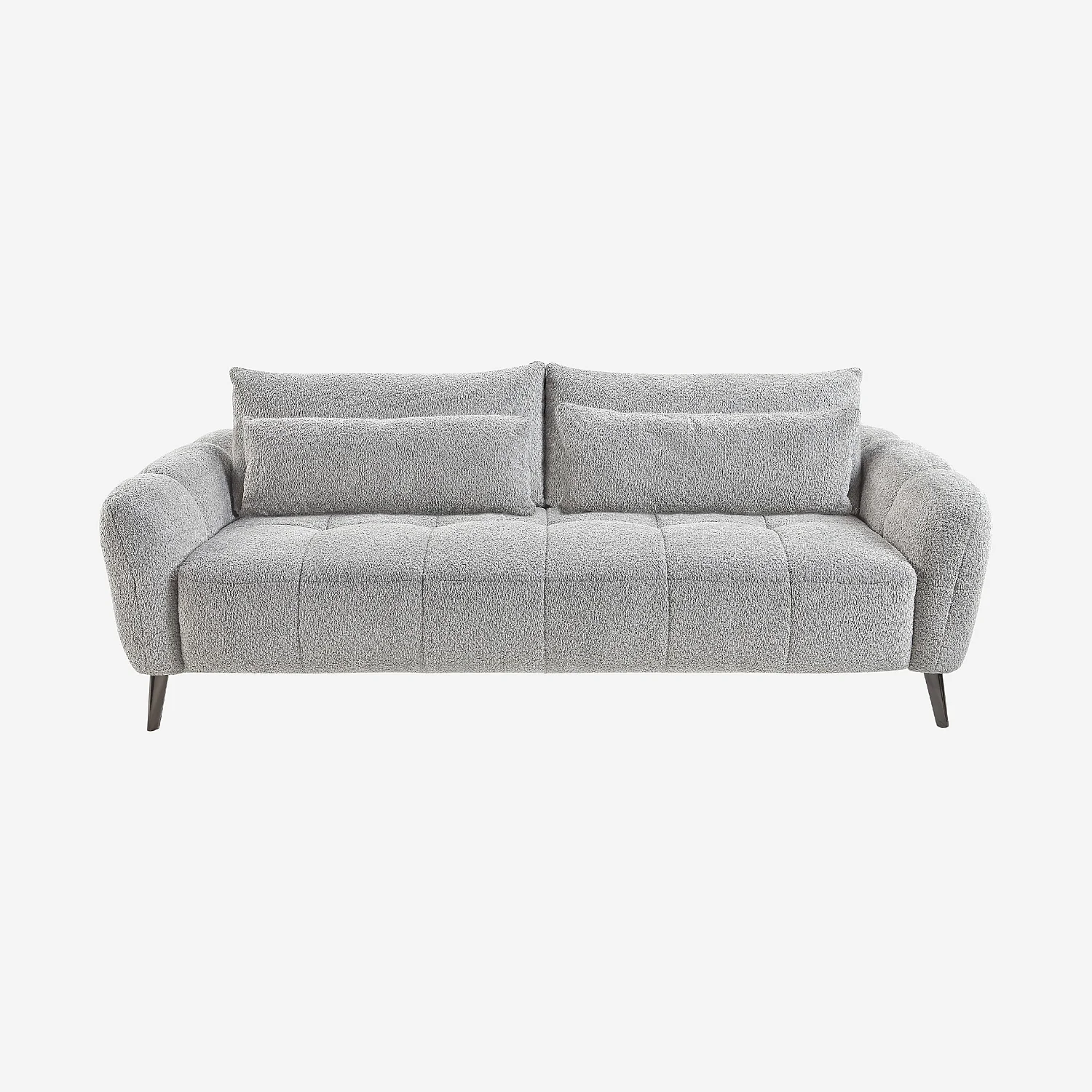 Son revêtement en tissu bouclette courte, dans une teinte gris polaire raffinée, séduit par sa texture douce et tendance. Les finitions matelassées et les deux coussins déhoussables assortis complètent l’ensemble avec élégance.