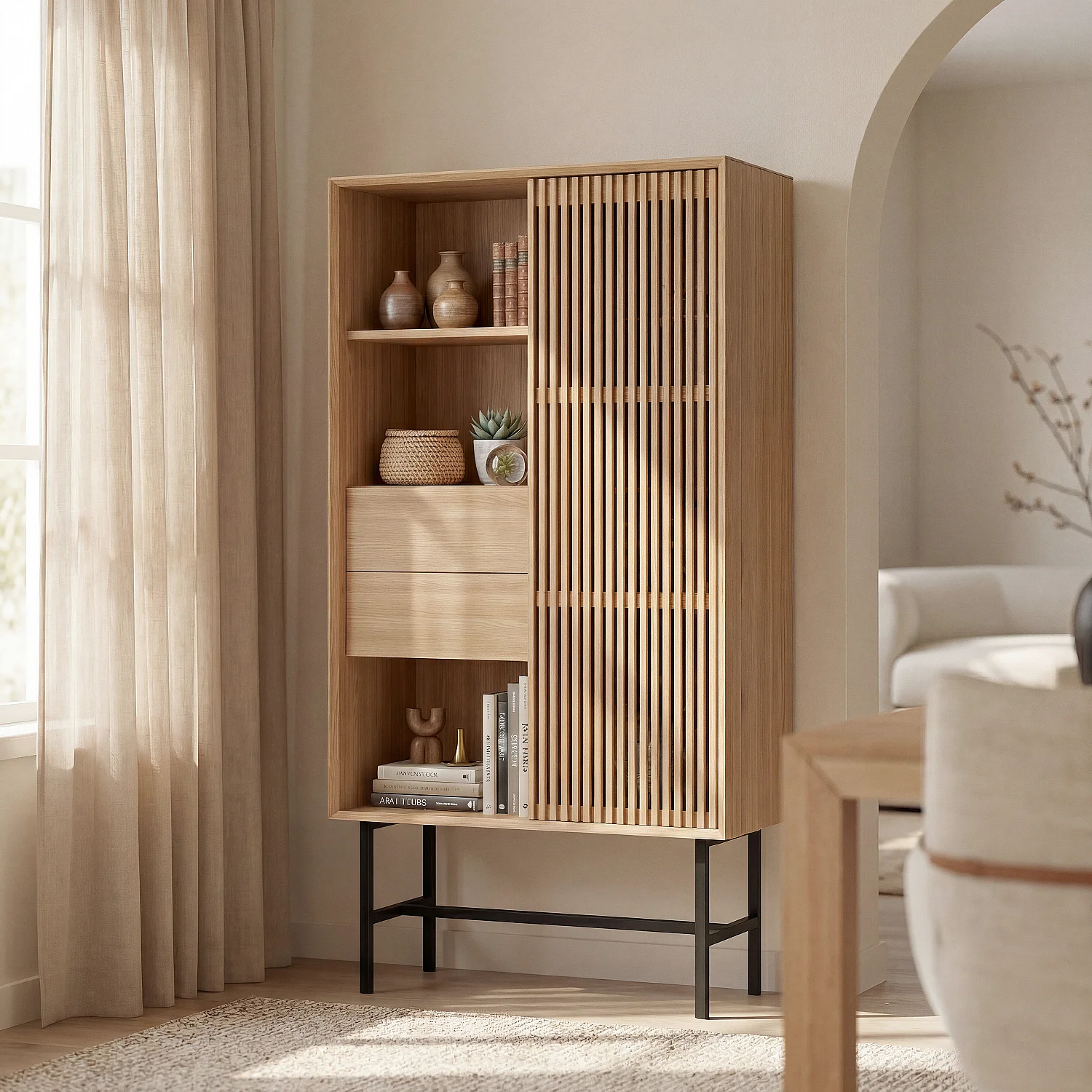 Ses portes coulissantes finement dessinées apportent une touche graphique tout en optimisant l’espace, révélant une esthétique maîtrisée qui valorise la chaleur du bois et la justesse des proportions. Chaque détail est pensé pour offrir un mobilier élégant, agréable à vivre et parfaitement adapté aux usages du quotidien.