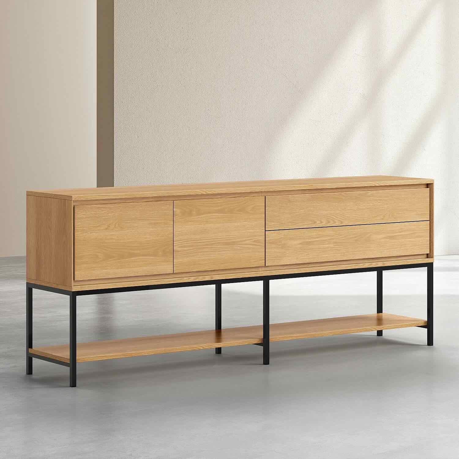 Buffet Flavie en chêne et métal noir, design Hélèna Pille. 2 portes, 2 tiroirs et tablette ouverte pour un rangement élégant et fonctionnel au style contemporain.