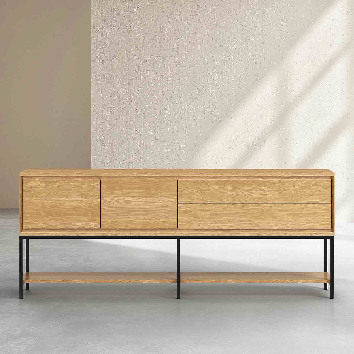 Le buffet dispose de deux portes et deux tiroirs offrant un espace de rangement généreux, idéal pour la vaisselle, le linge de maison ou les accessoires du quotidien. Une tablette ouverte inférieure permet d’exposer quelques objets décoratifs et d’aérer l’ensemble.