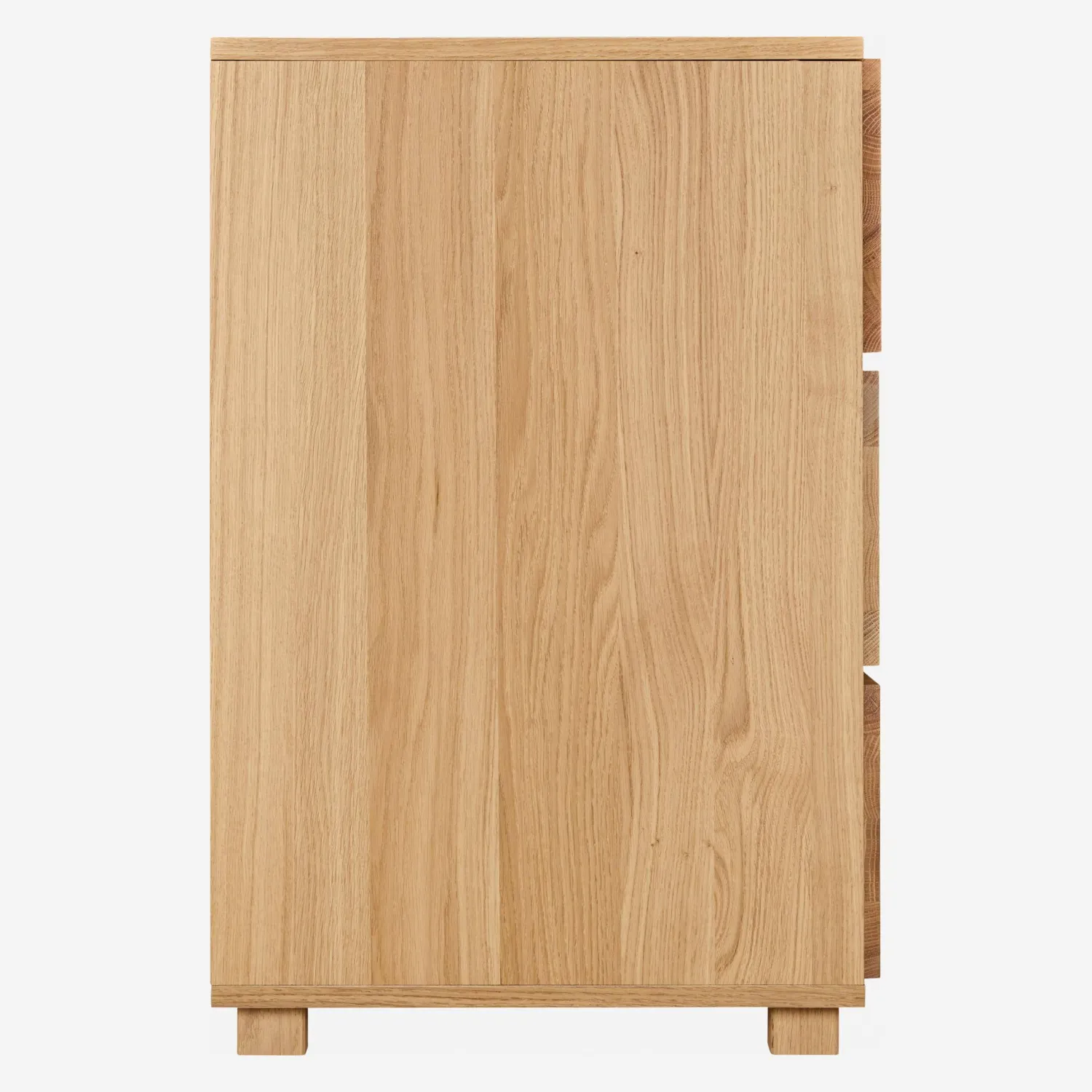 Composée de 9 tiroirs de tailles variées, Hanita offre une modularité de rangement optimale. Vêtements, accessoires ou linge de maison trouvent aisément leur place grâce à la diversité des volumes proposés. L’absence de poignées souligne la pureté du dessin et met en valeur la texture naturelle du chêne.