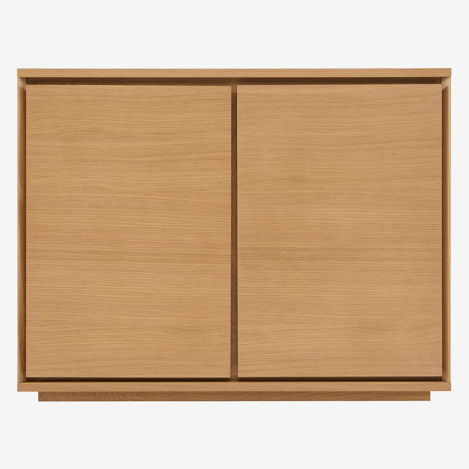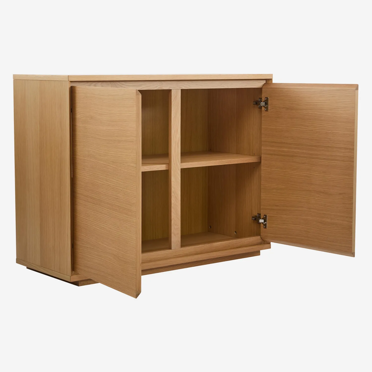 Buffet bas Hazo en chêne naturel : design épuré, 2 portes et 4 compartiments de rangement, élégance intemporelle.
