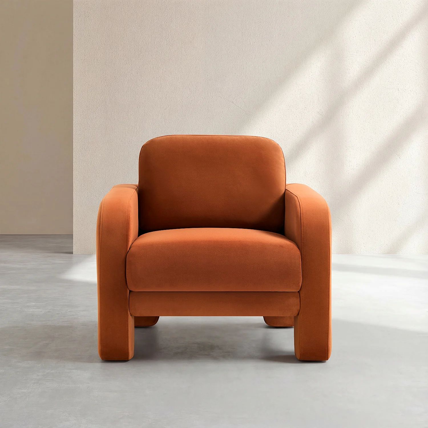 Le fauteuil Braga affirme un style résolument design, porté par une silhouette sculpturale et audacieuse. Ses lignes arrondies et pleines créent une allure graphique tout en douceur. Ce jeu de volumes généreux confère au fauteuil une présence forte, tout en conservant une sensation d’équilibre. Le revêtement en velours terracotta ajoute une touche de chaleur contemporaine. Pensé comme une pièce à part entière, le fauteuil Braga combine esthétique singulière et assise accueillante pour offrir un vrai moment de détente.