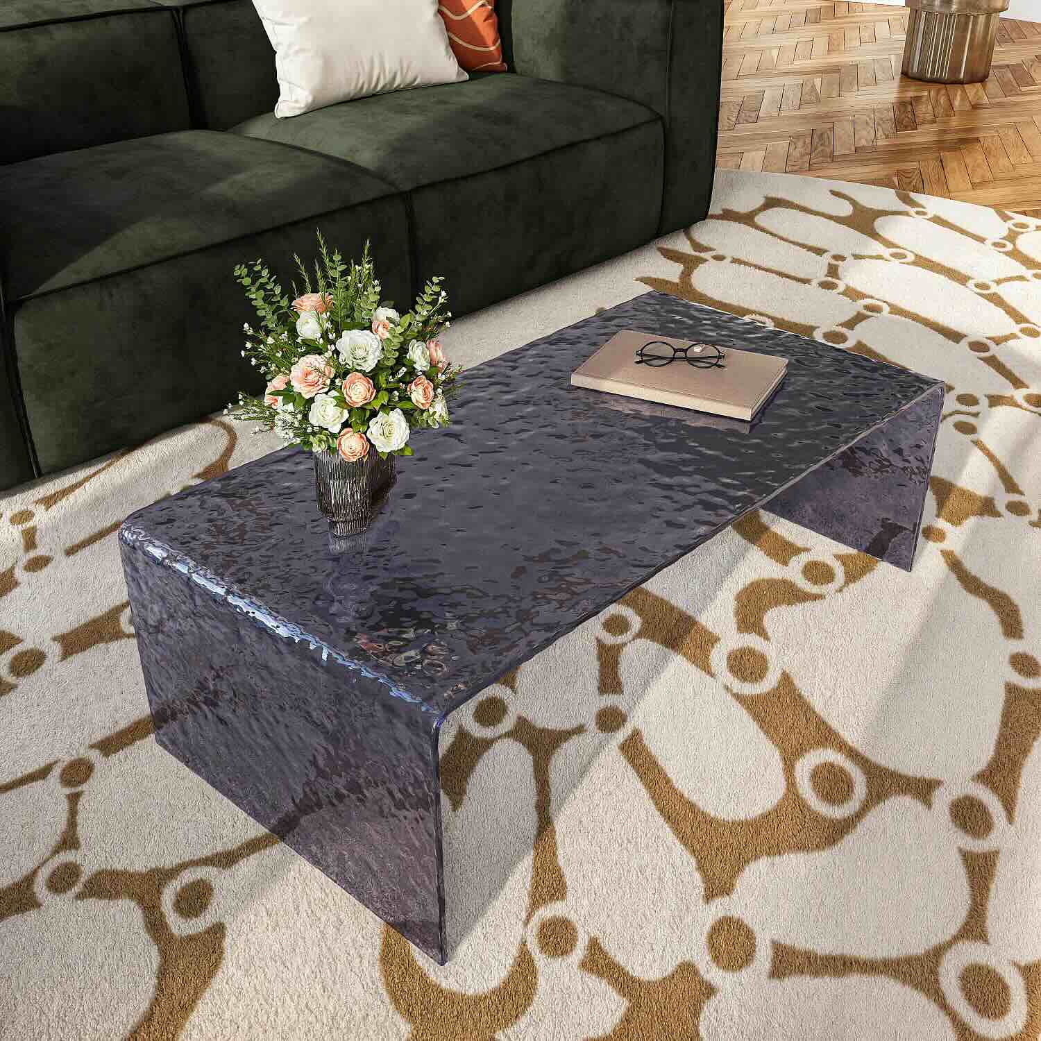 Table basse Izlana en verre trempé bullé gris fumé. Design rectangulaire et texturé pour un salon contemporain alliant transparence, équilibre et élégance.