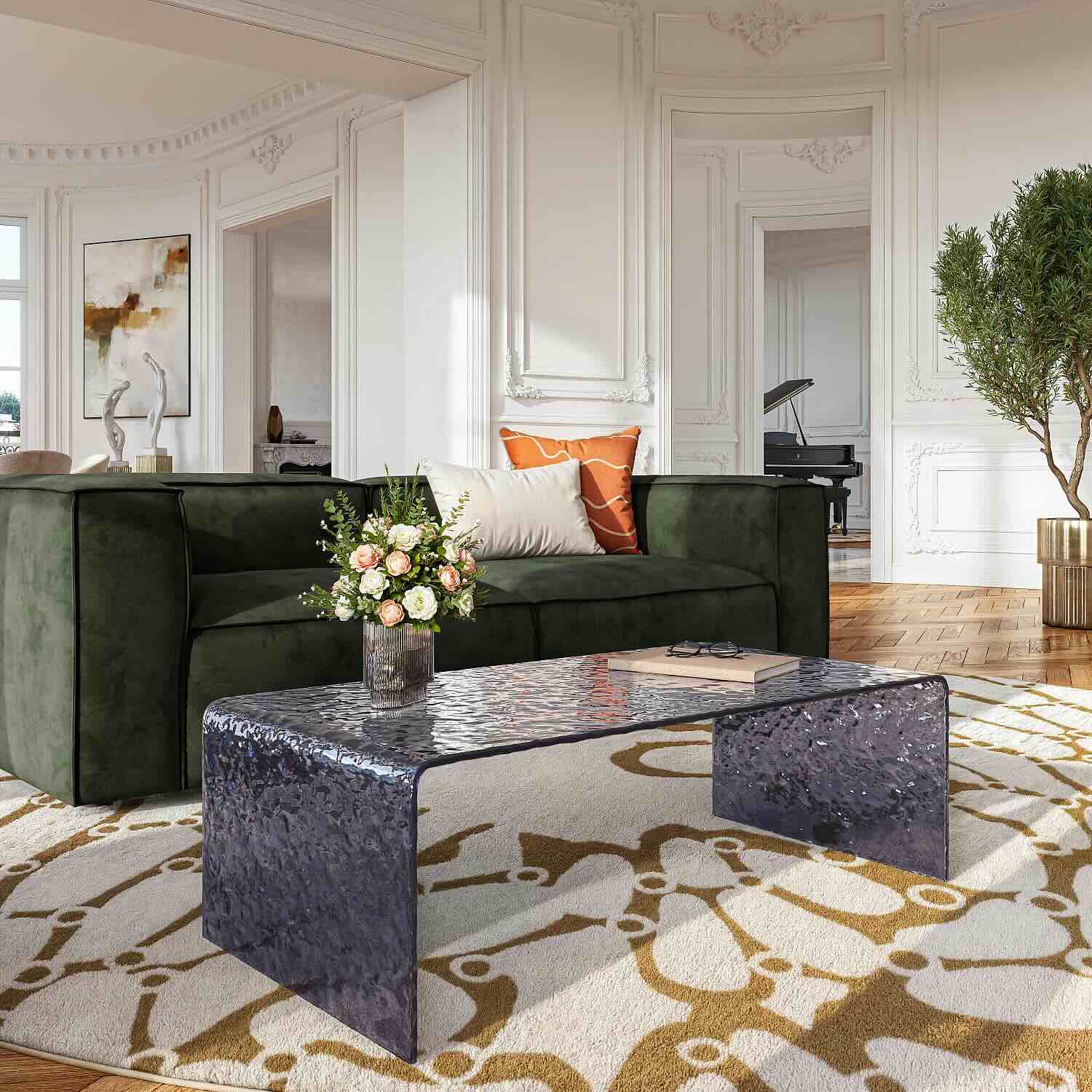 Pensée comme une pièce maîtresse du salon, Izlana structure la pièce avec finesse et légèreté. Son design tout en verre met en valeur la pureté des lignes et s’associe aisément à différents matériaux — bois, métal ou textile — pour créer des contrastes harmonieux.