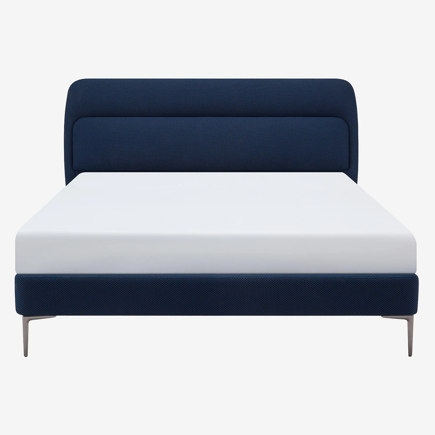 Sa tête de lit et son cadre sont revêtus d’un tissu 3D bleu marine, au maillage alvéolé et respirant, garantissant une régulation thermique et une résistance durable. Ce revêtement unique combine design et technologie pour un confort optimal.