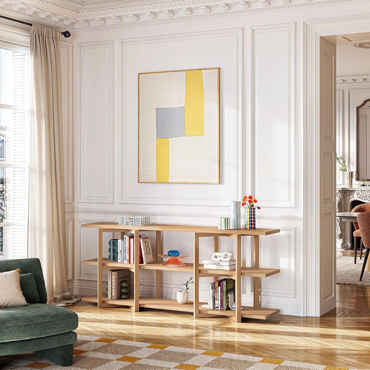La bibliothèque basse Janoa séduit par son design sobre et contemporain, idéal pour structurer un intérieur avec élégance et simplicité. Conçue en chêne naturel, elle met en valeur la beauté du bois et apporte une atmosphère chaleureuse et authentique à votre espace de vie.
