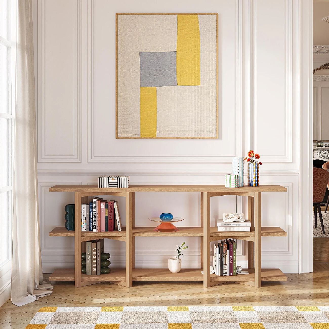 Dotée de trois larges étagères ouvertes, cette bibliothèque offre un rangement fonctionnel et accessible, parfait pour organiser livres, objets décoratifs, paniers ou plantes. Son format bas permet de l’intégrer facilement dans un salon, un bureau ou une chambre, tout en conservant une sensation d’espace et de légèreté visuelle.