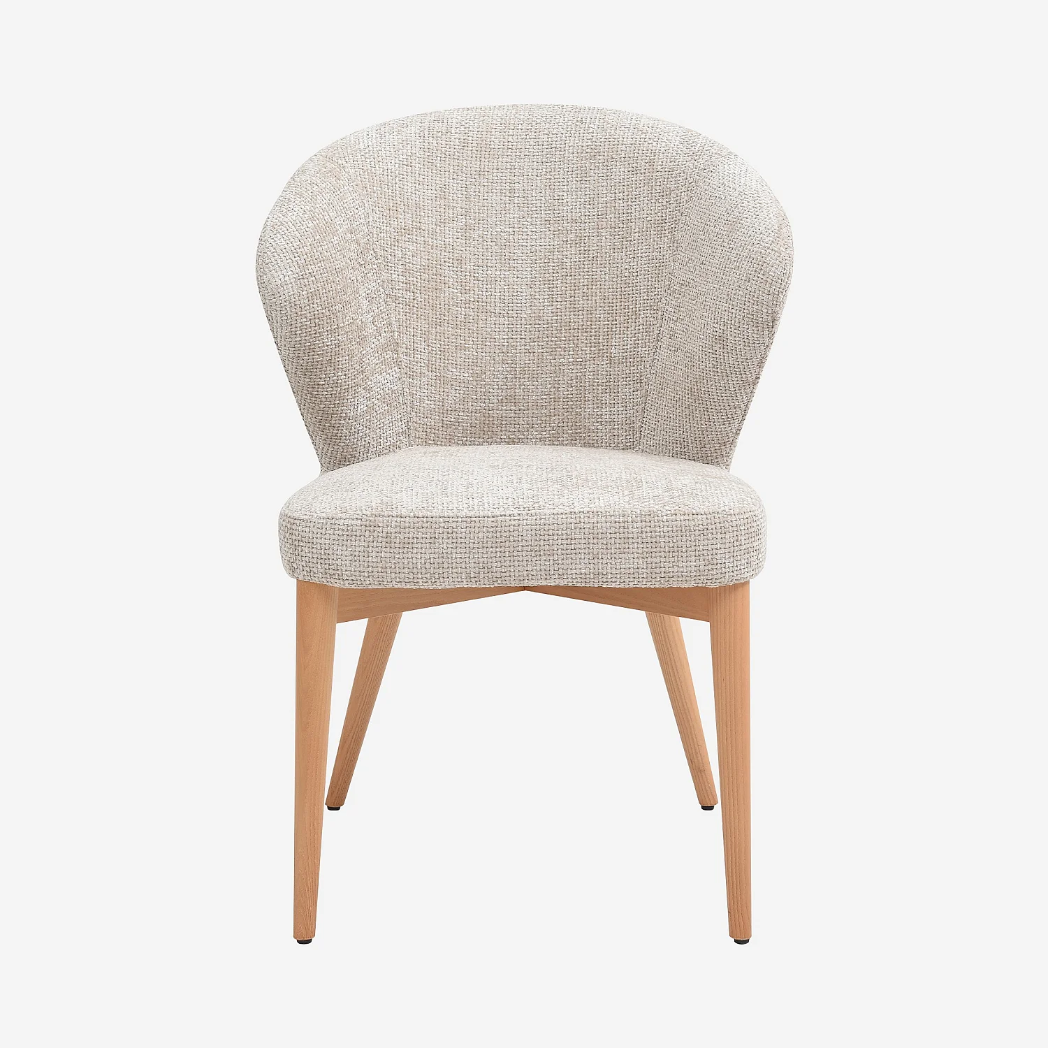 Le lot de 2 chaises Luris crème associe tissu chenille doux, piètement en bois massif et courbes enveloppantes pour un confort élégant et naturel.