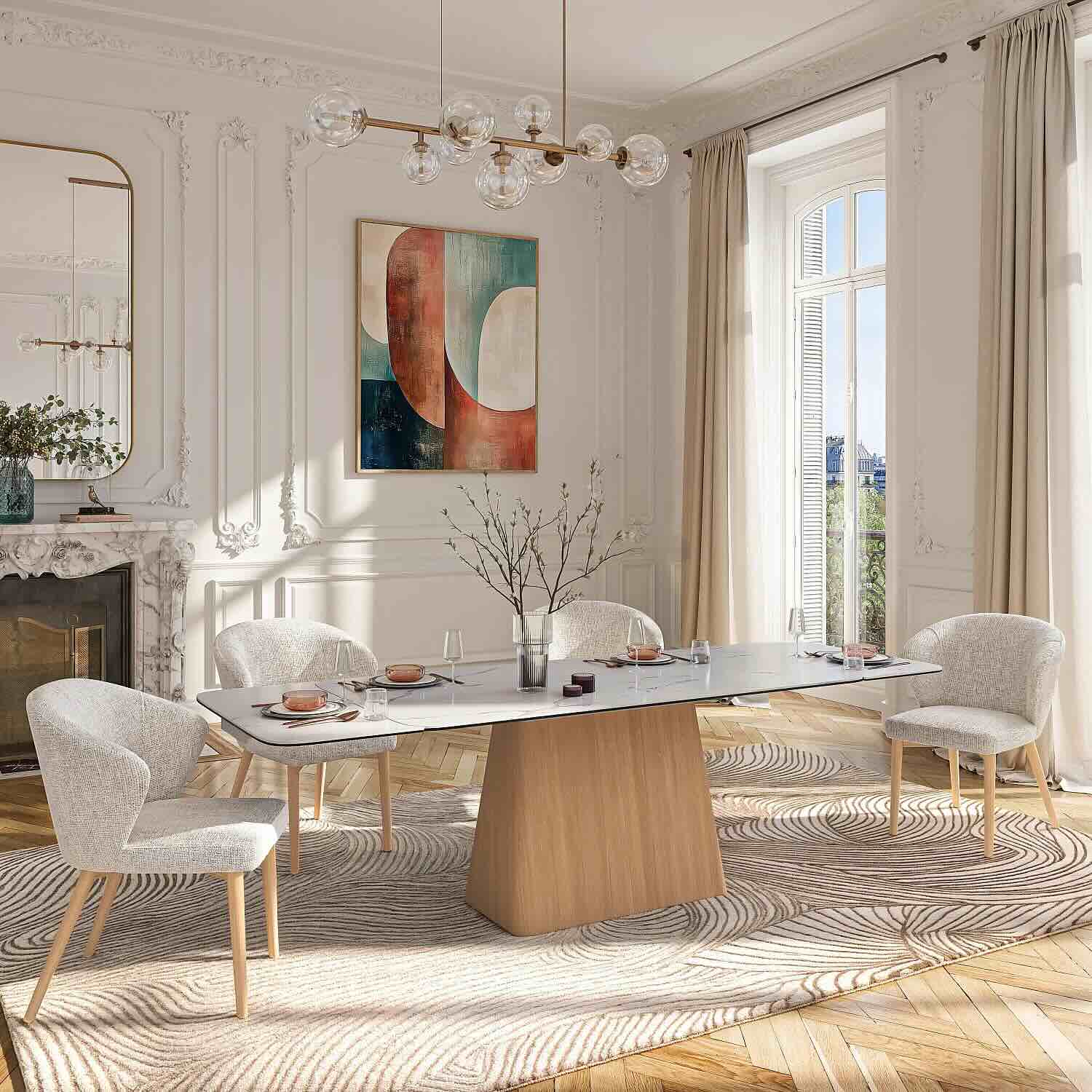 Le tissu chenille révèle un toucher velouté et un relief délicat, sublimé par une teinte crème moderne et harmonieuse. Ce contraste se marie parfaitement avec le piètement en bois massif couleur chêne, qui apporte une chaleur naturelle et une stabilité raffinée.