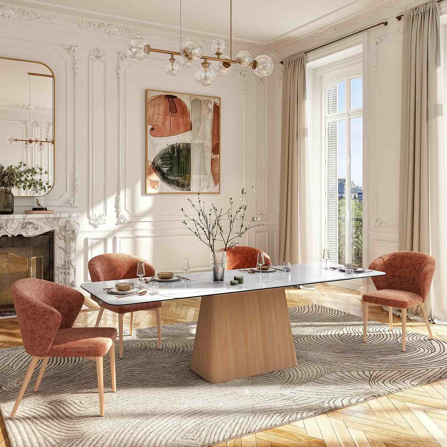 Le tissu chenille révèle un toucher velouté et un relief délicat, sublimé par une teinte terracotta profonde et harmonieuse. Ce contraste se marie parfaitement avec le piètement en bois massif couleur chêne, qui apporte une chaleur naturelle et une stabilité raffinée.