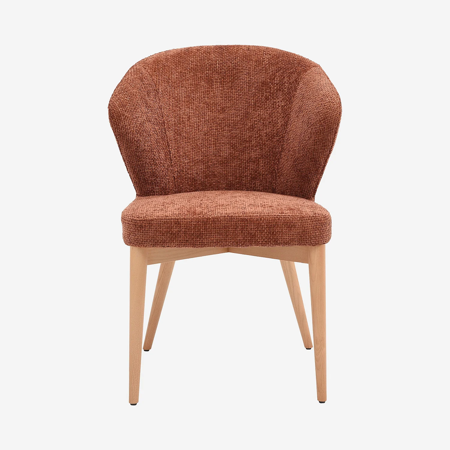 Le lot de 2 chaises Luris terracotta associe tissu chenille doux, piètement en bois massif et courbes enveloppantes pour un confort élégant et naturel.