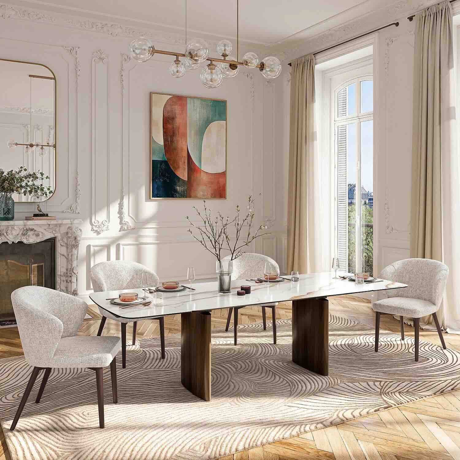 Leur assise moelleuse et leur dossier incurvé offrent un maintien agréable, idéal pour des repas prolongés ou des moments de convivialité. Le tissu chenille, à la fois épais et velouté, dévoile un relief subtil qui met en valeur la teinte crème, élégante et intemporelle.