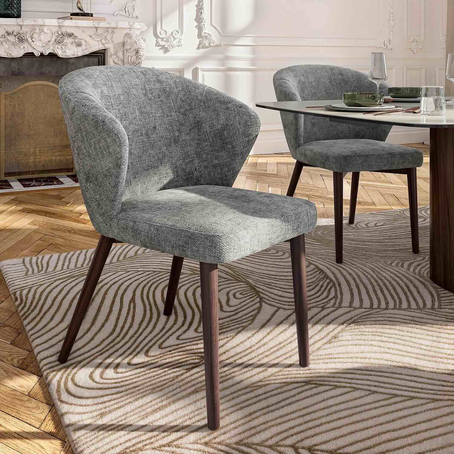 Le lot de 2 chaises élégantes et confortables, les chaises Luris en tissu chenille gris argent et bois noyer allient douceur, design et raffinement pour sublimer la salle à manger.