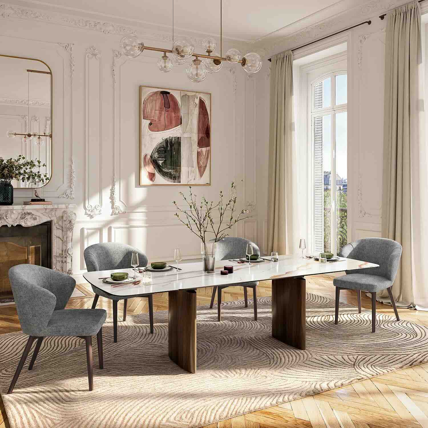 Les pieds en bois massif couleur noyer viennent réchauffer l’ensemble d’une note naturelle et raffinée. Ce mariage de textures et de matières confère à la chaise Luris une présence harmonieuse, capable de s’intégrer aussi bien dans un intérieur contemporain que dans une décoration plus classique.