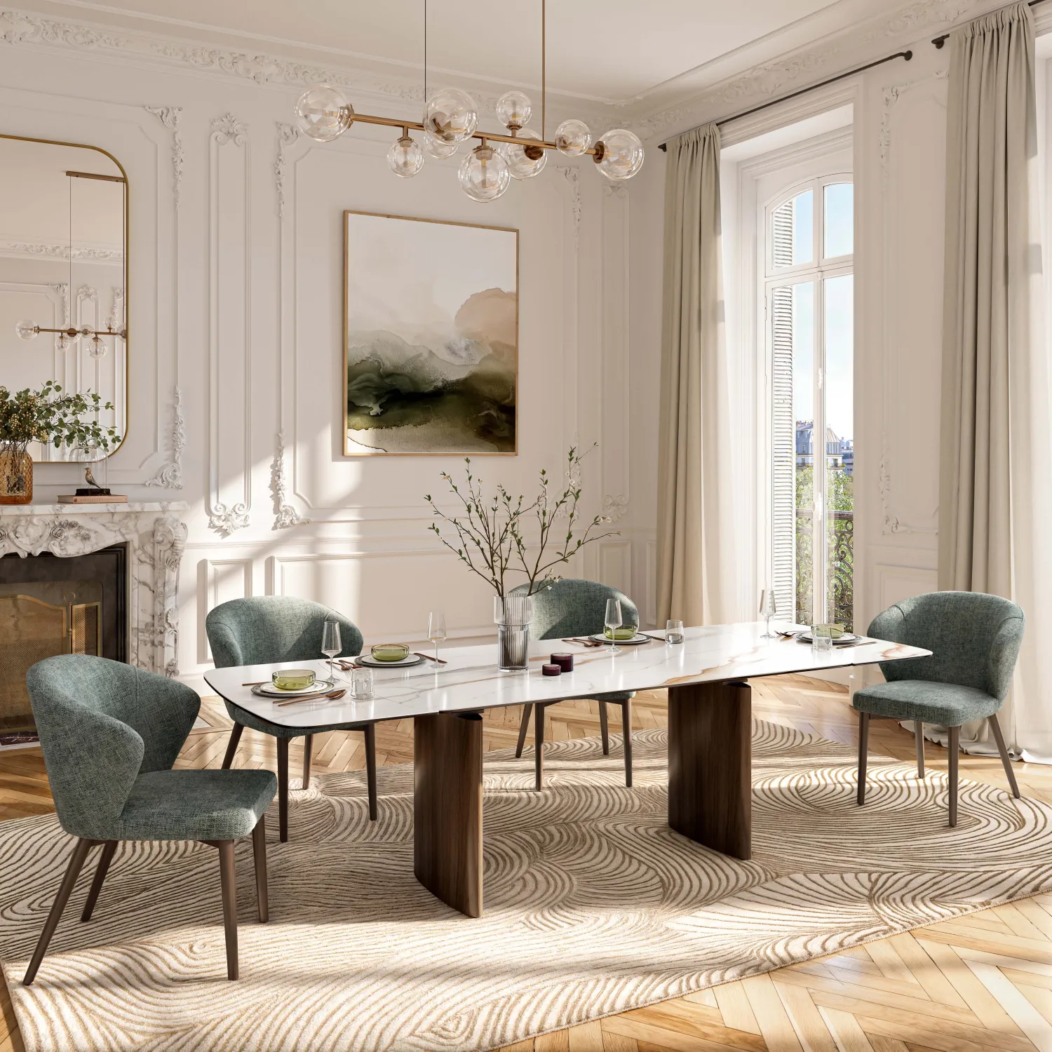 Les pieds en bois massif couleur noyer viennent réchauffer l’ensemble d’une note naturelle et raffinée. Ce mariage de textures et de matières confère à la chaise Luris une présence harmonieuse, capable de s’intégrer aussi bien dans un intérieur contemporain que dans une décoration plus classique.