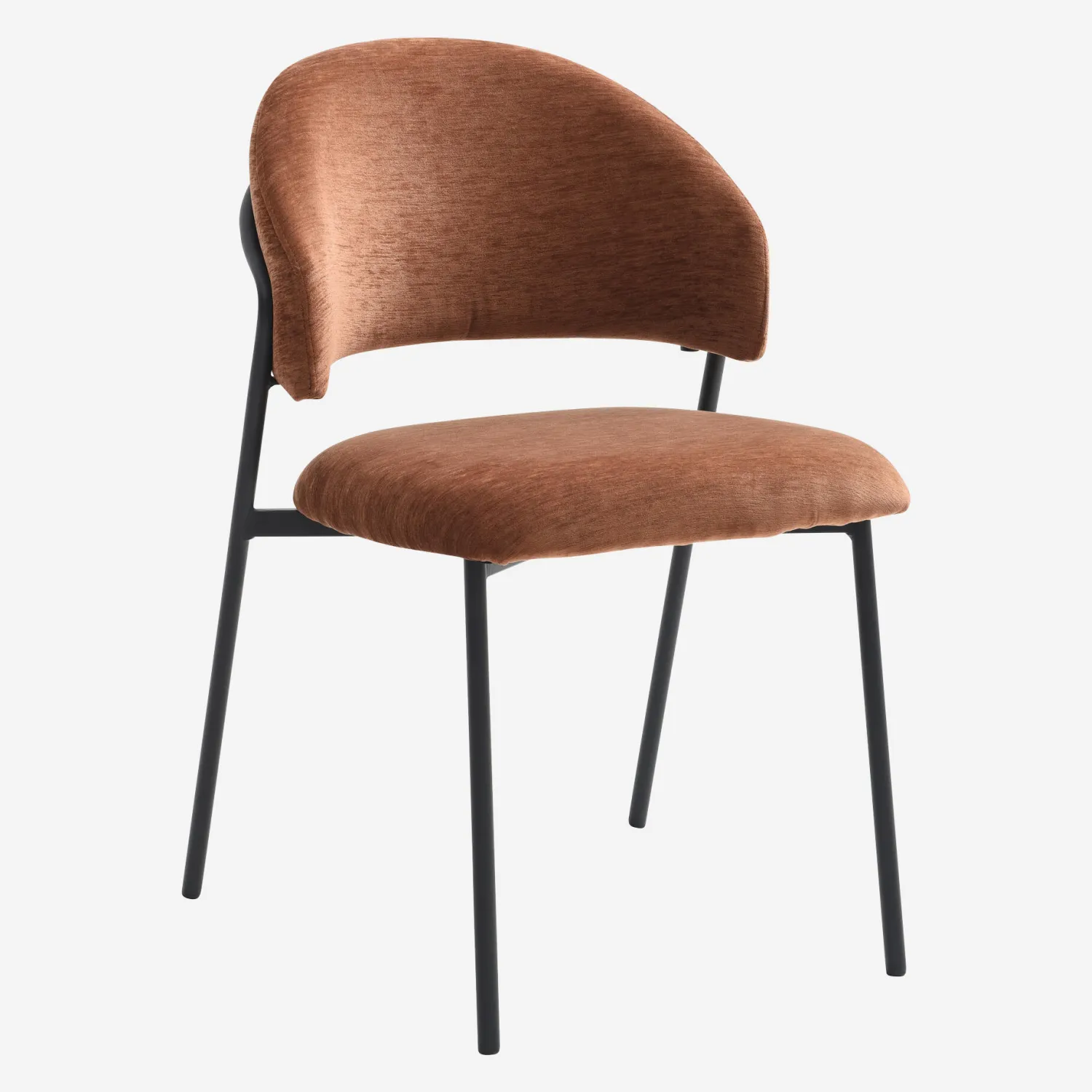 Chaise en tissu marron cuivré et métal noir. Élégantes, modernes et confortables pour une salle à manger sophistiquée.