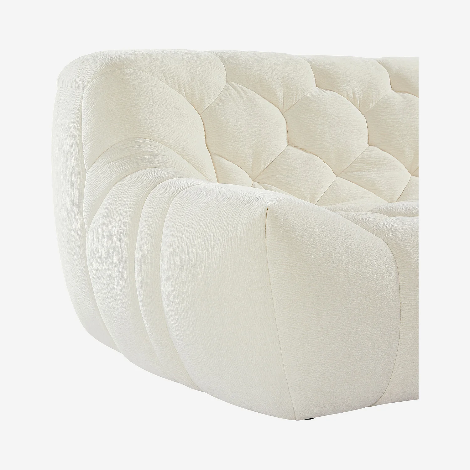 Canapé Melfi 3 places en tissu écru. Matelassage raffiné, lignes enveloppantes et confort généreux pour un salon contemporain et élégant.