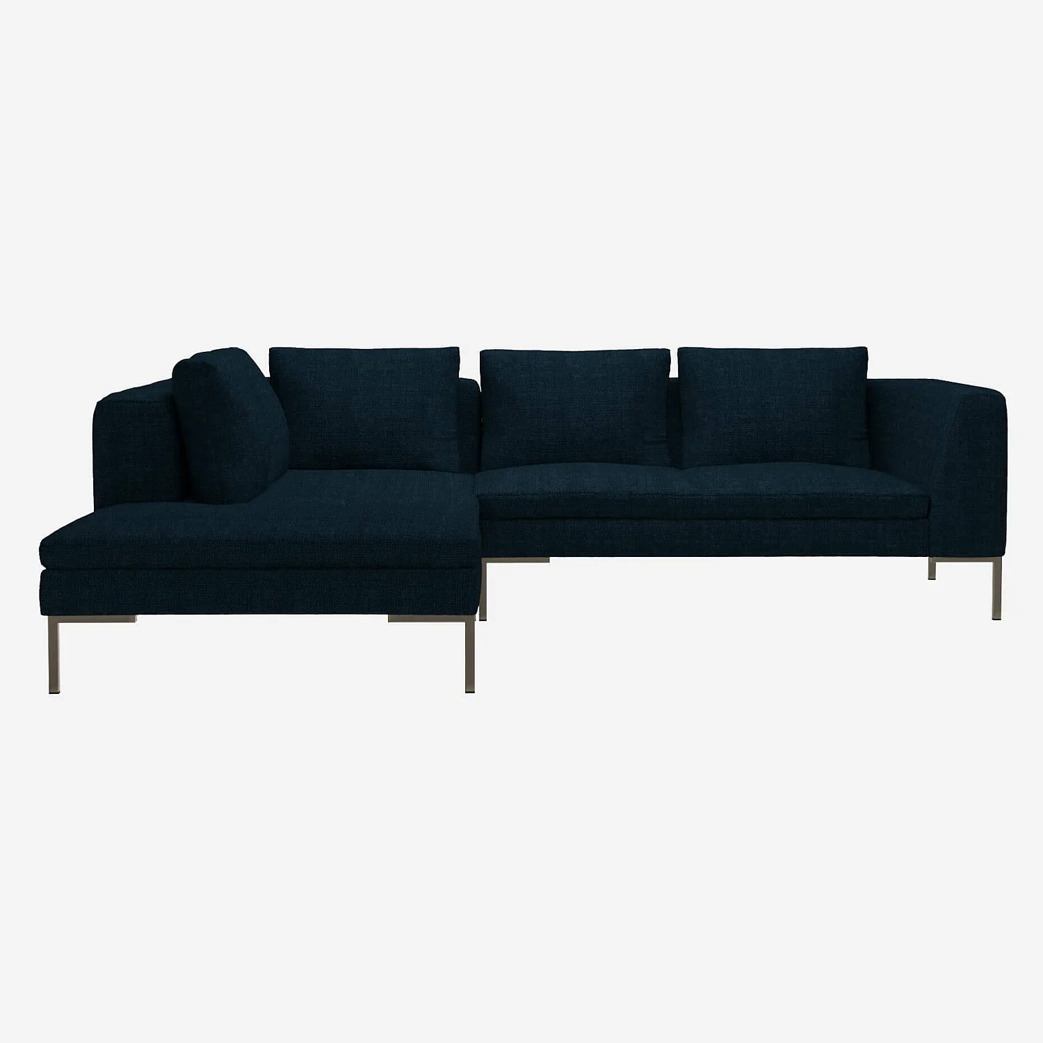 Le canapé d’angle gauche Montino en tissu Melina bleu encre invite à la détente grâce à son assise moelleuse et ses accoudoirs hauts. Ses lignes droites, élégantes et équilibrées lui confèrent une allure graphique distinctive, idéale pour structurer un salon contemporain.
