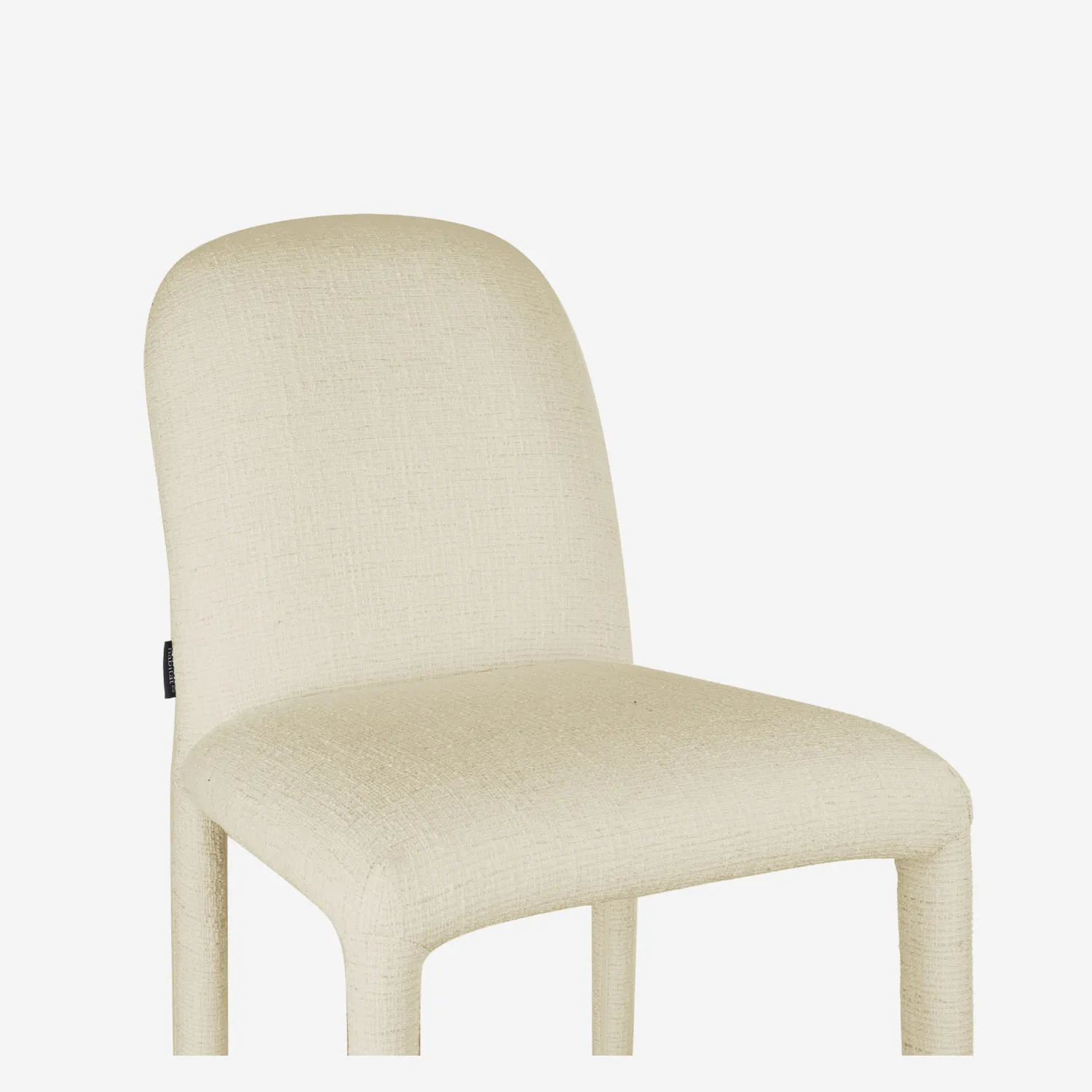Le revêtement en tissu sable blanc diffuse une douce clarté naturelle, idéale pour illuminer la pièce tout en apportant une sensation de légèreté. L’assise et le dossier rembourrés de mousse garantissent un maintien agréable et un confort durable, parfait pour les repas du quotidien.
