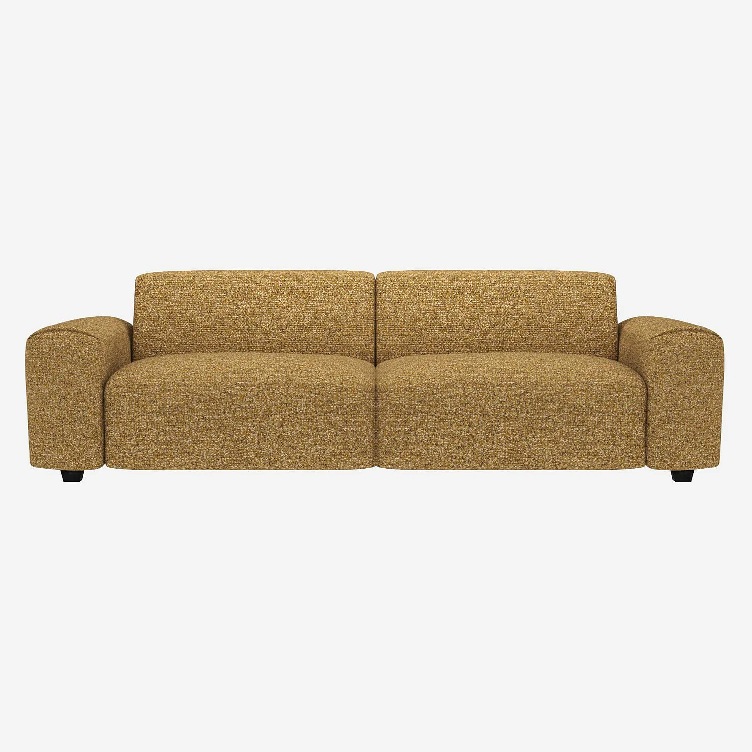 Le canapé droit Posada en tissu Venezia jaune épice incarne l’élégance confortable. Son design accueillant se reconnaît à ses formes rebondies, à ses coutures minutieusement travaillées et aux finitions en ourlet qui soulignent ses accoudoirs. Cette attention portée aux détails lui donne une présence harmonieuse, à la fois douce et raffinée.