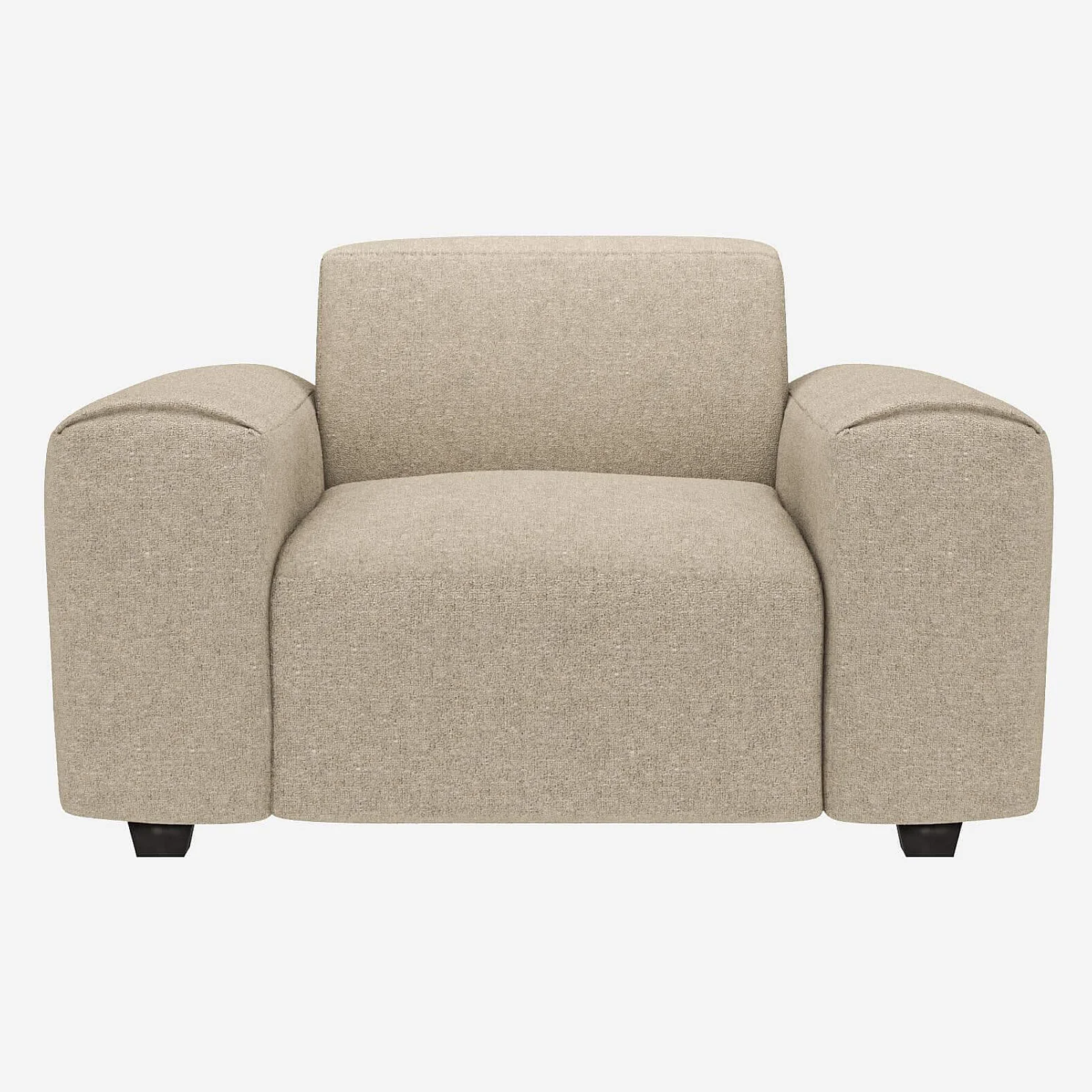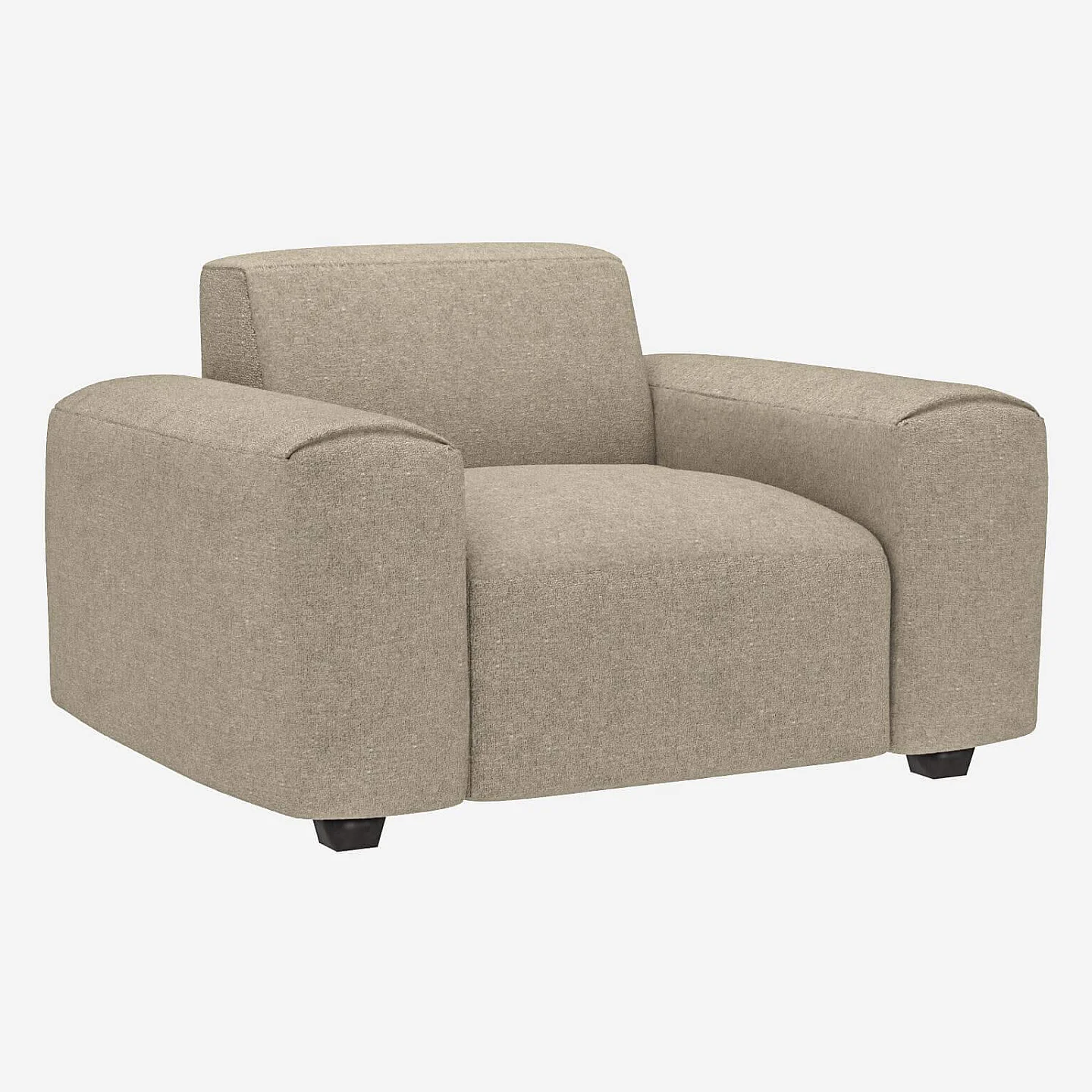 Son revêtement Lucca , un tissu exclusif Habitat composé de polyester et d’acrylique, offre un toucher agréable, une belle tenue et un rendu visuel chaleureux. Moelleuse et enveloppante, son assise mêle mousse et plumes pour un confort profond, tandis que ses accoudoirs rembourrés renforcent la sensation de détente.