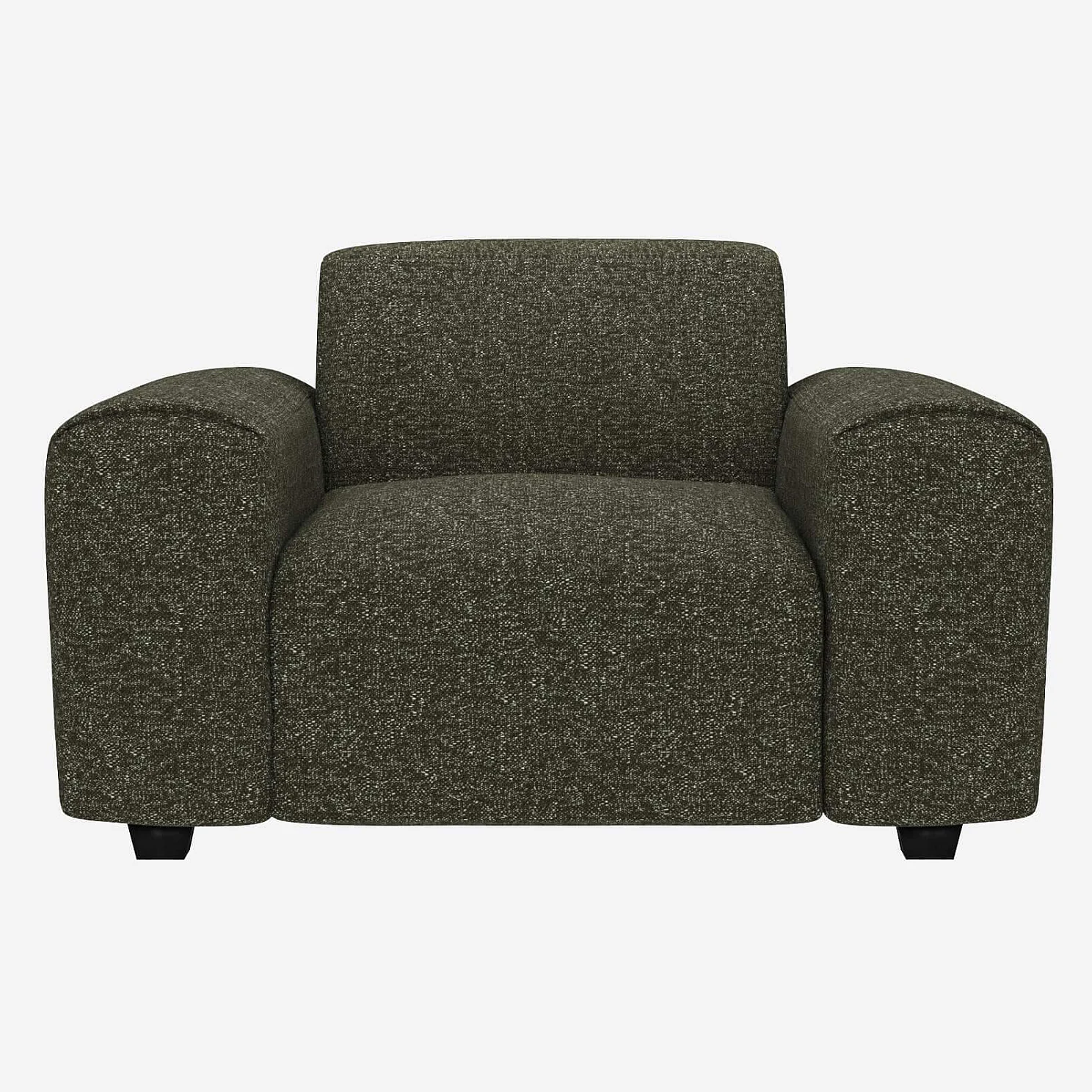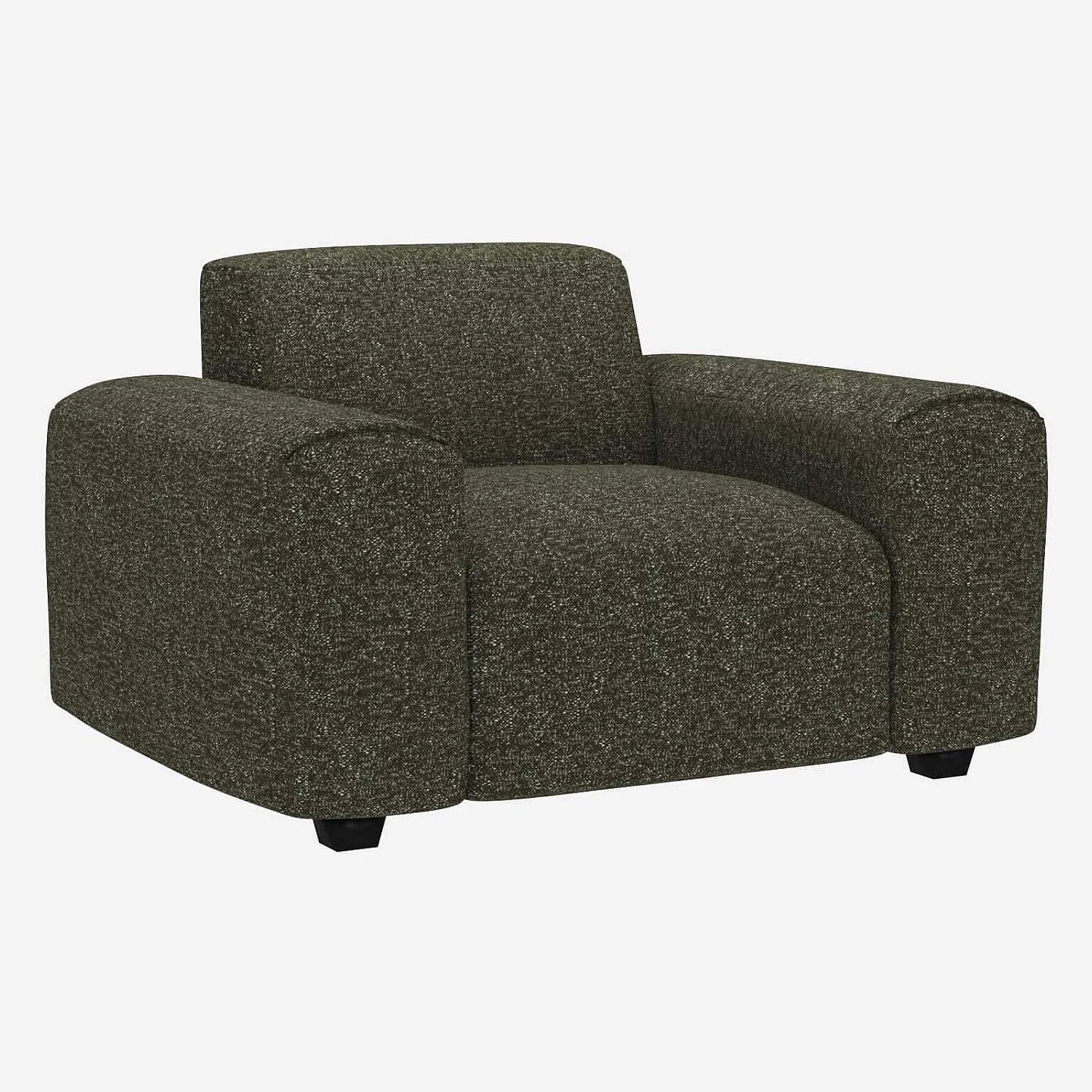 Son revêtement Lucca , un tissu exclusif Habitat composé de polyester et d’acrylique, offre un toucher agréable, une belle tenue et un rendu visuel chaleureux. Moelleuse et enveloppante, son assise mêle mousse et plumes pour un confort profond, tandis que ses accoudoirs rembourrés renforcent la sensation de détente.