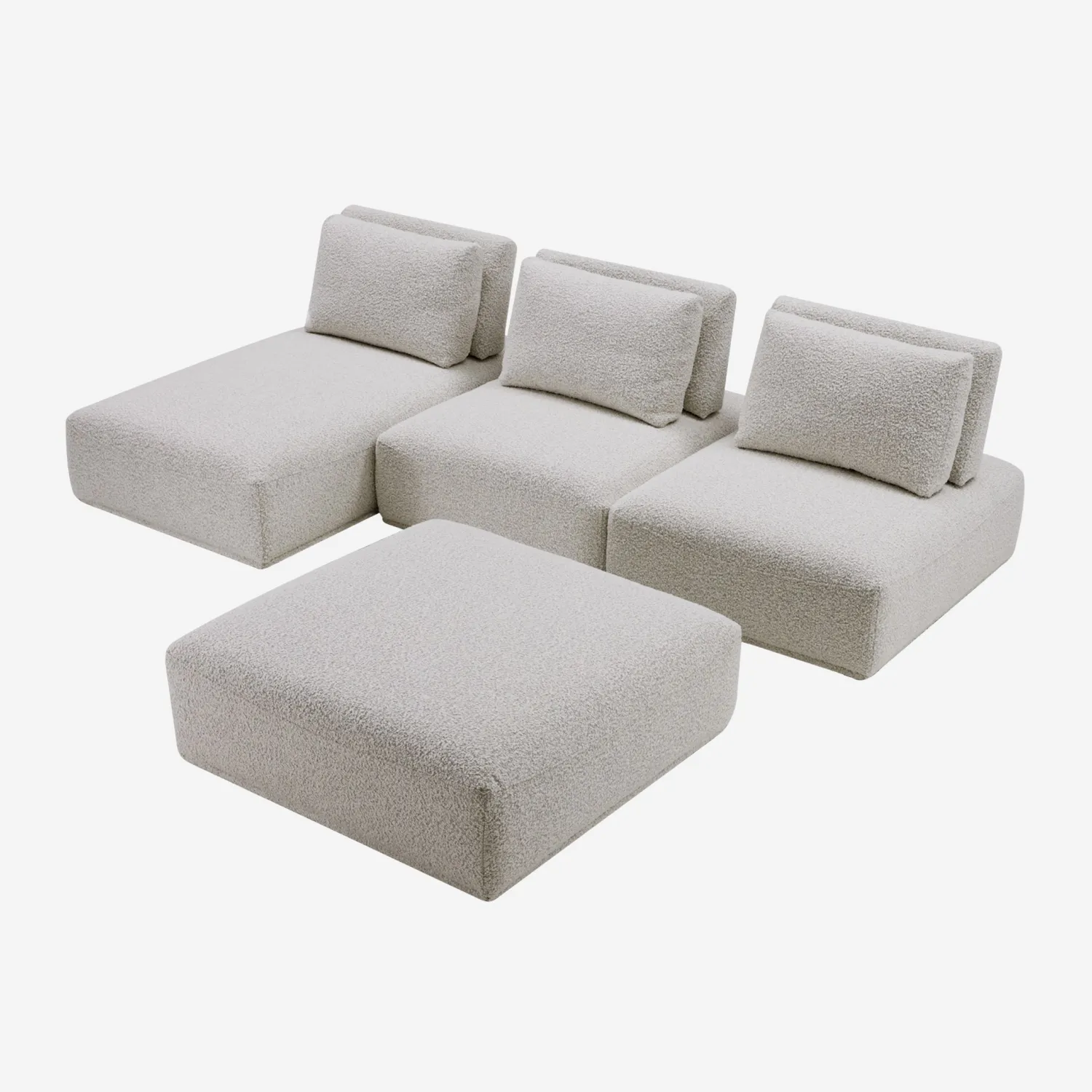 Son garnissage en mousse garantit une assise moelleuse et durable, offrant un soutien idéal pour les moments de détente. Le revêtement en tissu bouclette, au toucher doux et à la texture chaleureuse, se pare d’un gris perle lumineux, conférant à l’ensemble une allure élégante et intemporelle.