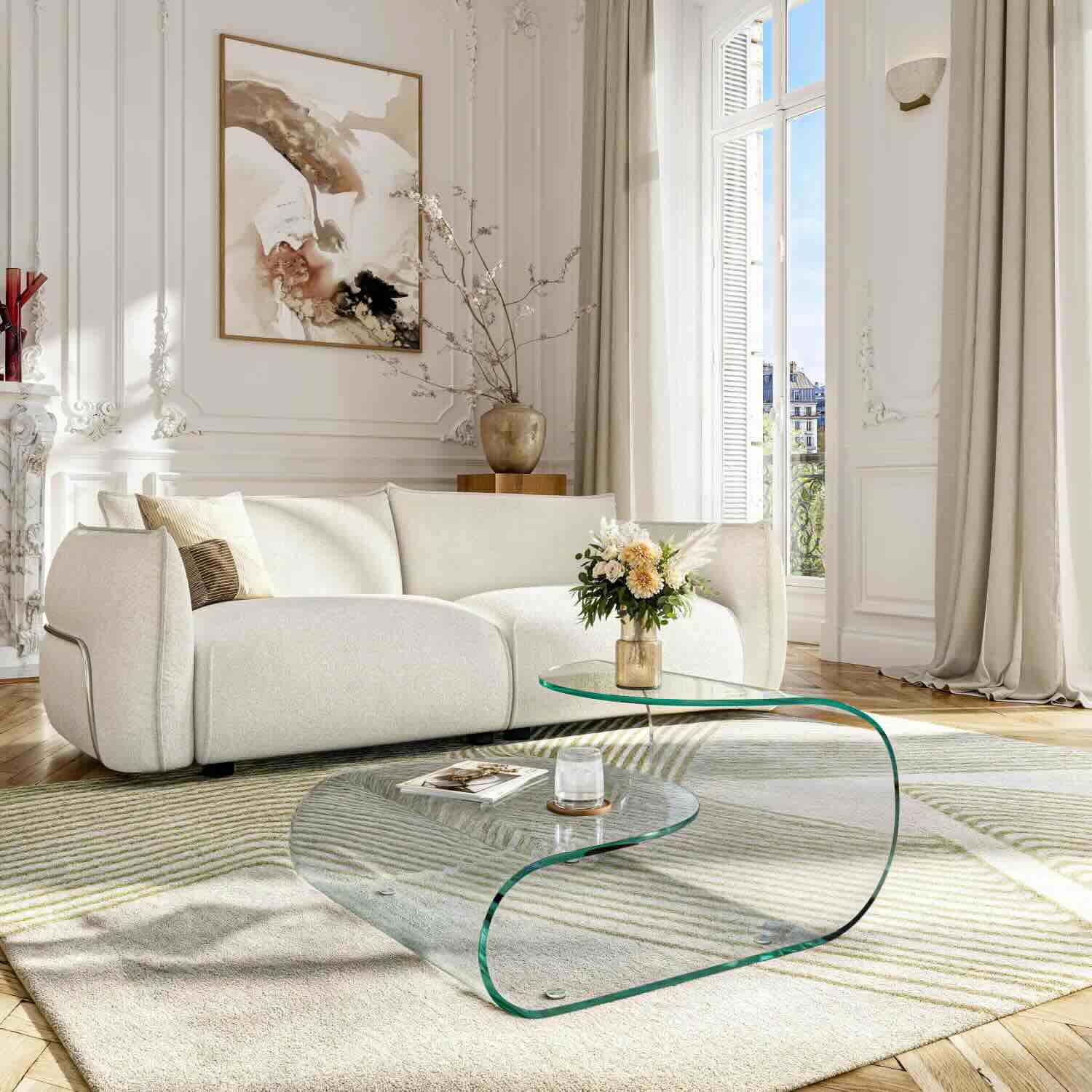 Son double plateau asymétrique en verre transparent attire le regard et apporte un équilibre raffiné dans le salon. Cette conception allie transparence, résistance et légèreté visuelle, parfaites pour les intérieurs contemporains.