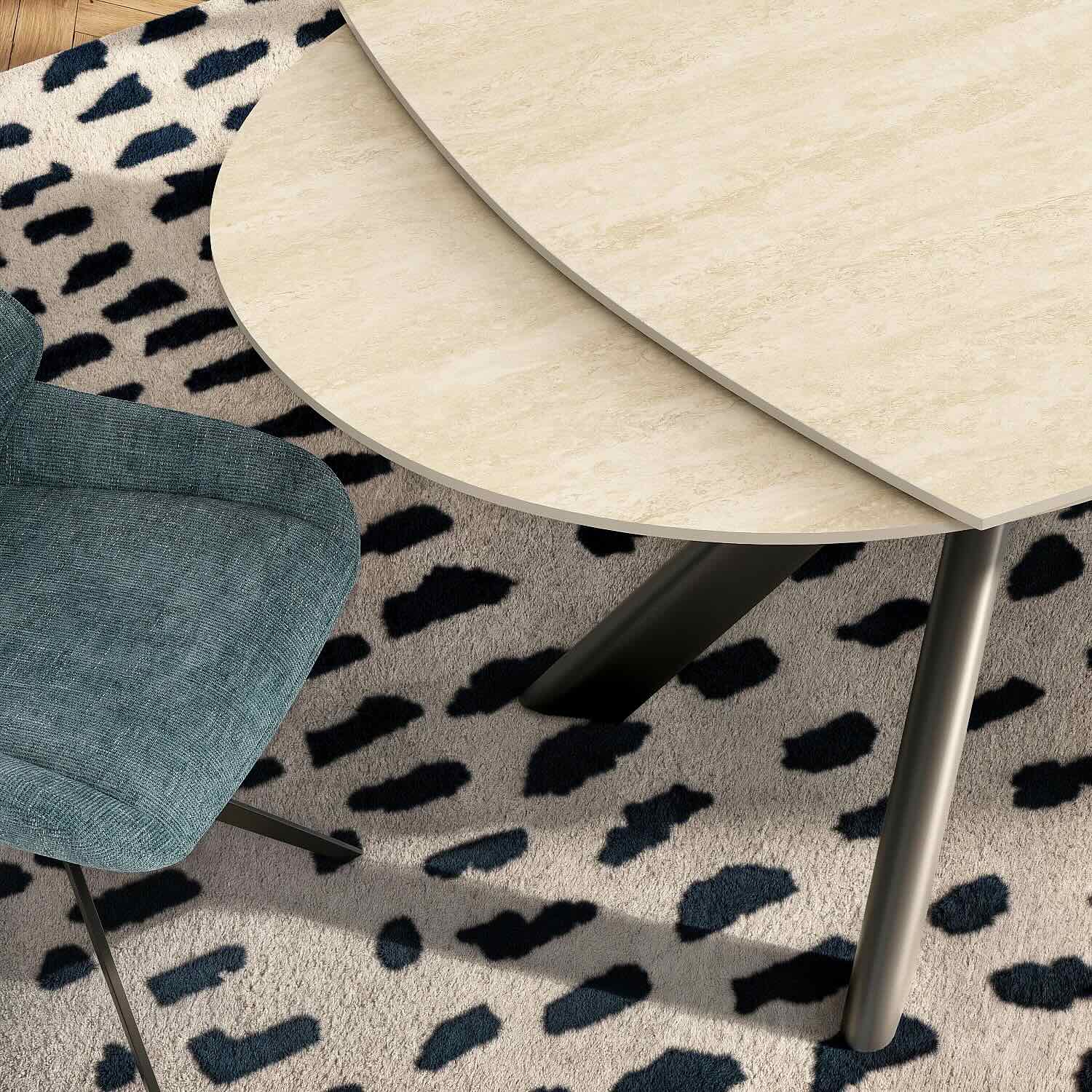 La table ovale Tibur combine modernité et allure sculpturale. Son plateau en céramique effet travertin et ses pieds noirs design accueillent jusqu’à 10 convives grâce à un système d’extension discret.