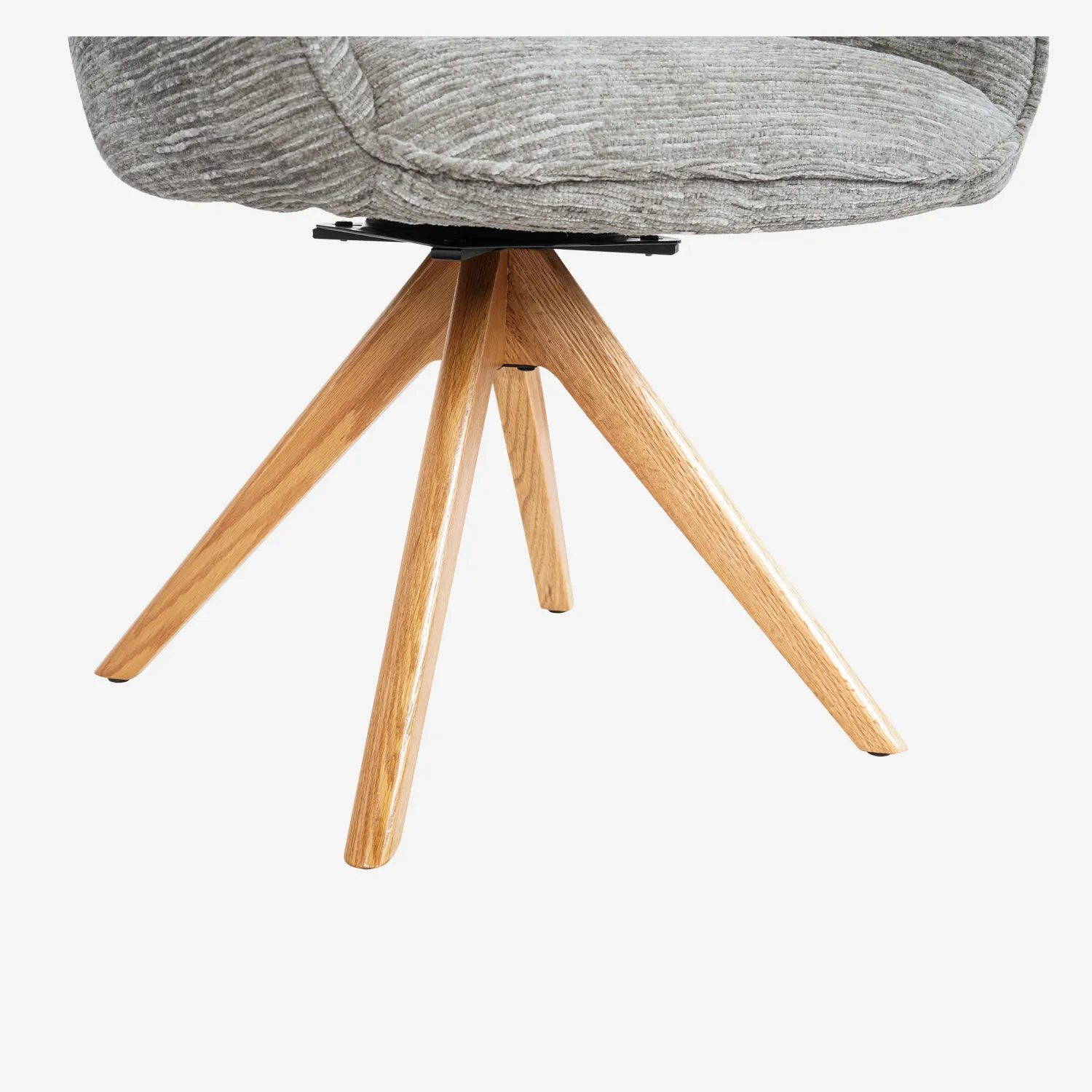 La chaise Timiso allie tissu texturé gris argent, ressorts ensachés et piètement en chêne pour un confort durable et une élégance naturelle au quotidien.