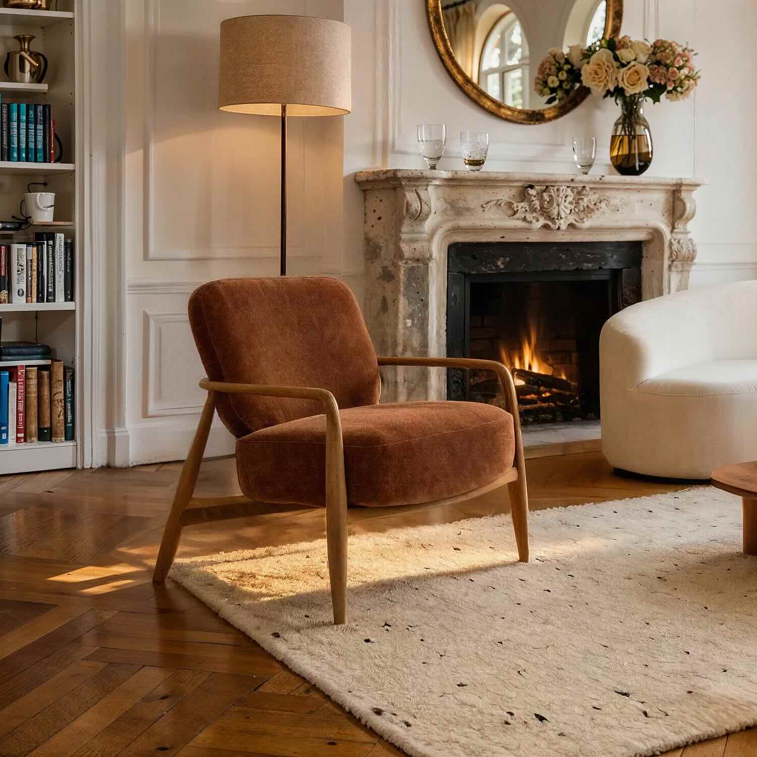 Tissu doux, structure en bois massif et lignes contemporaines définissent Velika. Un fauteuil élégant et chaleureux, pensé pour offrir confort et caractère au salon.