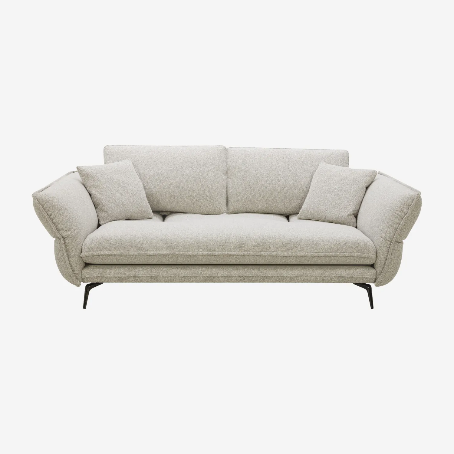 Son assise généreusement garnie assure un maintien durable et agréable, tandis que la structure légèrement évasée des accoudoirs et les pieds fins en métal soulignent son allure aérienne.
